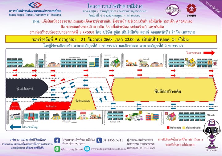การรถไฟฟ้าขนส่งมวลชนแห่งประเทศไทย (รฟม.) แจ้งว่า บริษัท ยูนิค เอ็นจิเนียริ่ง แอนด์ คอนสตรัคชั่น จำกัด (มหาชน) ผู้รับจ้างงานออกแบบและก่อสร้างอุโมงค์ทางวิ่งและสถานีใต้ดิน โครงการรถไฟฟ้าสายสีม่วง ช่วงเตาปูน - ราษฎร์บูรณะ (วงแหวนกาญจนาภิเษก) สัญญาที่ 4 ช่วงสะพานพุทธ - ดาวคะนอง มีความจำเป็นต้องปิดเบี่ยงจราจรบนถนนสมเด็จพระเจ้าตากฝั่งขาเข้า บริเวณบริษัท เอ็มไดร์ฟ ฮอนด้า ดาวคะนอง ถึง ซอยสมเด็จพระเจ้าตากสิน 36 เพื่อดำเนินงานก่อสร้างกำแพงกันดิน งานก่อสร้างปล่องระบายอากาศที่ 3 (VS03) ระหว่างวันที่ 9 กรกฎาคม – 31 ธันวาคม 2568 เวลา 22.00 น. เป็นต้นไป ตลอด 24 ชั่วโมง โดยผู้ใช้ทางฝั่งขาเข้า สามารถสัญจรได้ 1 ช่องจราจร และฝั่งขาออก สามารถสัญจรได้ 2 ช่องจราจร