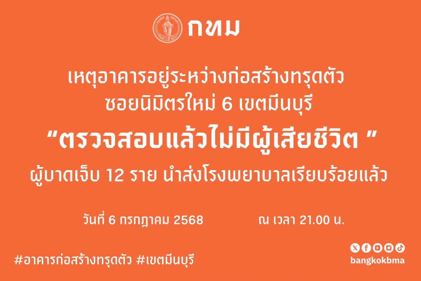 ล่าสุดเพจ กรุงเทพมหานครโพสต์รายงาน เพิ่มเติม เหตุการณ์ดังกล่าว ไม่มีผู้ติดค้างภายใน ในที่เกิดเหตุมีผู้ได้รับบาดเจ็บ จำนวน 12 ราย และอาสาสมัครนำส่งโรงพยาบาลเป็นที่เรียบร้อย เจ้าหน้าที่ชุดปฏิบัติการภายในอาคารเข้าตรวจสอบไม่มีผู้ได้รับบาดเจ็บและผู้ติดค้างภายในอาคารเพิ่มเติม