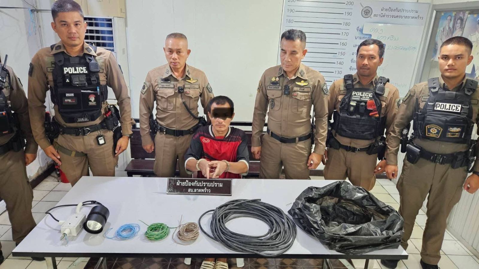 8 ก.ค. 68 นายเอกวรัญญู อัมระปาล โฆษกของกรุงเทพมหานคร เปิดเผยถึงการจับกุมผู้ลักลอบตัดสายไฟบน Skywalk บริเวณสามแยกบางกะปิ ว่า เมื่อวันที่ 6 ก.ค. 68 เวลาประมาณ 17.00 น. เจ้าพนักงานตำรวจชุดจับกุมได้รับแจ้งเหตุจากพลเมืองดี ว่ามีคนร้ายกำลังลักลอบตัดสายไฟบน Skywalk บริเวณสามแยกบางกะปิ จึงเดินทางไปตรวจสอบที่เกิดเหตุ พบ นายดวง (นามสมมุติ) ผู้ต้องหาอยู่บริเวณจุดที่ได้รับแจ้ง เป็นบุคคลต้องสงสัยตามที่รับแจ้ง จึงได้ทำการตรวจค้น พบโคมไฟแบบกลมสีดำ ยี่ห้อ SYLVANIA จำนวน 1 ดวง ฉนวนเปลือกนอกหุ้มสายไฟ PVC สีดำ ขนาด 2 x 2.5/2.5 ความยาวประมาณ 4 เมตร จำนวน 6 เส้น ฉนวนสายไฟสีฟ้า ขนาด 2 มม. ความยาวประมาณ 3.2 เมตร จำนวน 1 เส้น ฉนวนสายไฟสีน้ำตาล ขนาด 2 มม. ความยาวประมาณ 6.8 เมตร จำนวน 2 เส้น และฉนวนสายไฟสีเขียว ขนาด 2 มม. ความยาวประมาณ 6.8 เมตร จำนวน 2 เส้น ซุกซ่อนอยู่ในถุงขยะสีดำ
