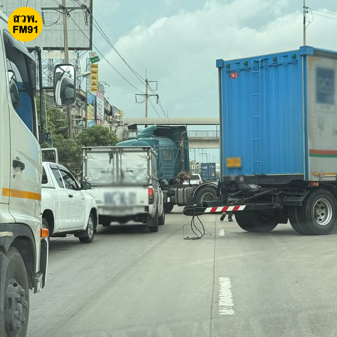 ปากซอยกิ่งแก้ว 37/5 รถบรรทุกตู้คอนเทนเนอร์ ลูกพ่วงขาด! กีดขวาง 2 เลนจากขวา ท้ายสะสมปากซอยกิ่งแก้ว 29/1