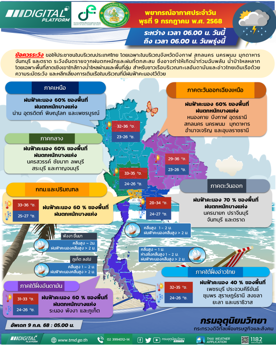 ลักษณะอากาศทั่วไป วันที่ 9 กรกฎาคม 2568 พยากรณ์อากาศ 24 ชั่วโมงข้างหน้า ประเทศไทยยังคงมีฝนตกหนักบางแห่ง ขอให้ประชาชนในบริเวณประเทศไทย โดยเฉพาะในบริเวณจังหวัดบึงกาฬ สกลนคร นครพนม มุกดาหาร จันทบุรี และตราด ระวังอันตรายจากฝนตกหนักและฝนที่ตกสะสม ซึ่งอาจทำให้เกิดน้ำท่วมฉับพลัน น้ำป่าไหลหลาก โดยเฉพาะพื้นที่ลาดเชิงเขาใกล้ทางน้ำไหลผ่านและพื้นที่ลุ่ม ทั้งนี้เนื่องจากมีหย่อมความกดอากาศต่ำปกคลุมบริเวณประเทศเวียดนามตอนบน ประกอบกับมรสุมตะวันตกเฉียงใต้กำลังปานกลางยังคงพัดปกคลุมทะเลอันดามัน ประเทศไทย และอ่าวไทย