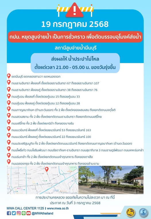 การประปานครหลวง (กปน.) ขอแจ้งให้ทราบว่า จะดำเนินการตัดบรรจบอุโมงค์ส่งน้ำ ในพื้นที่บริเวณสถานีสูบจ่ายน้ำมีนบุรี เพื่อให้ประชาชนได้รับบริการน้ำประปาอย่างเพียงพอและทั่วถึง จึงมีความจำเป็นต้องหยุดสูบจ่ายน้ำ สถานีสูบจ่ายน้ำมีนบุรี เป็นการชั่วคราว ในคืนวันเสาร์ที่ 19 กรกฎาคม 2568 ตั้งแต่เวลา 21.00 - 05.00 น. ของวันรุ่งขึ้น โดยระหว่างดำเนินการ ส่งผลให้ น้ำประปาไม่ไหล ในพื้นที่ดังต่อไปนี้