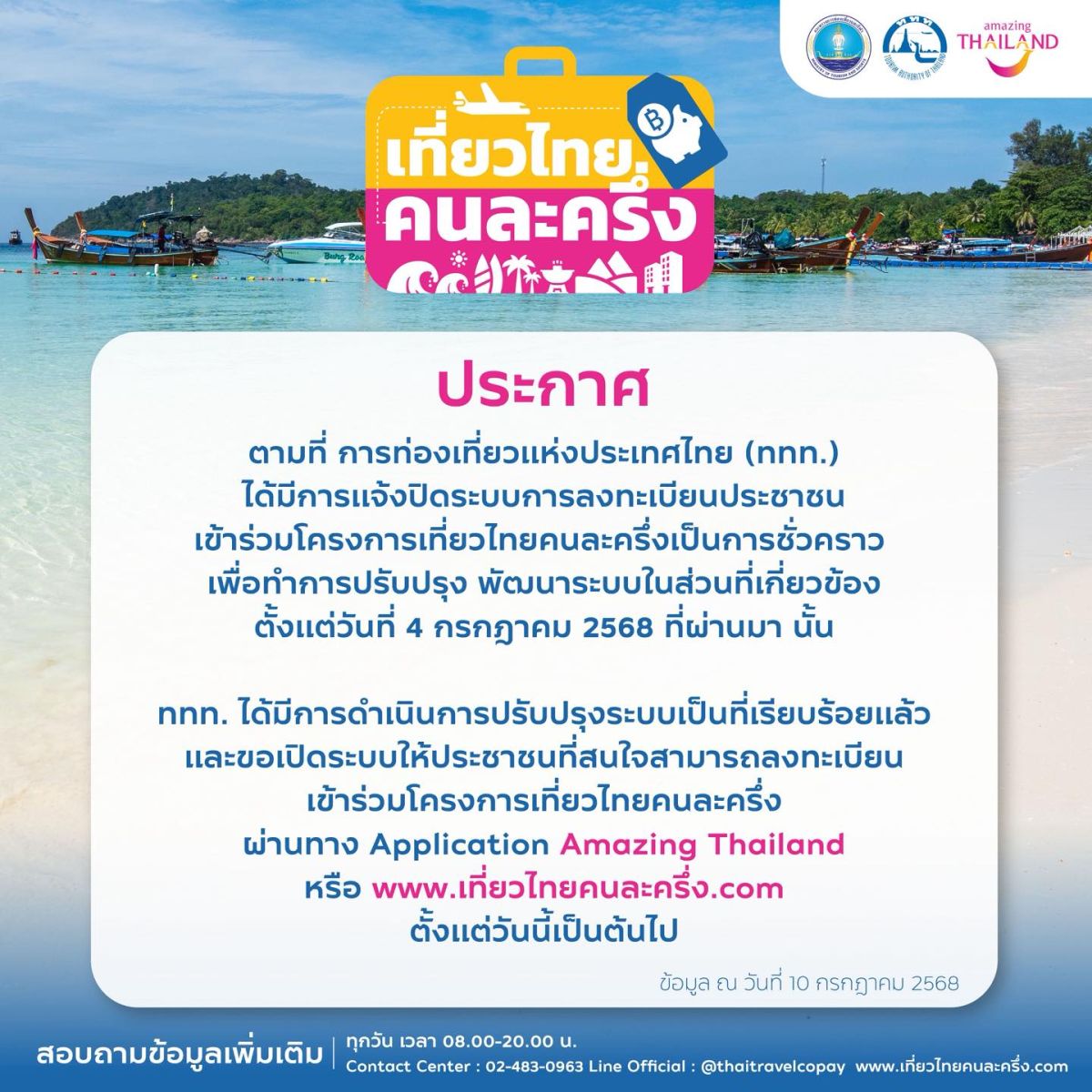10 กรกฎาคม 2568 ผู้สื่อข่าวรายงานว่า เฟซบุ๊ก “amazing thailand” โพสต์ข้อความระบุว่า ตามที่ การท่องเที่ยวแห่งประเทศไทย (ททท.) ได้มีการแจ้งปิดระบบการลงทะเบียนประชาชน เข้าร่วมโครงการเกี่ยวไทยคนละครึ่งเป็นการชั่วคราว เพื่อทำการปรับปรุง พัฒนาระบบในส่วนที่เกี่ยวข้อง ตั้งแต่วันที่ 4 กรกฎาคม 2568 ที่ผ่านมา นั้น