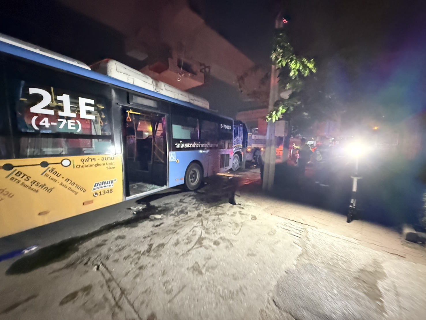 รถบรรทุกชนท้ายรถประจำทางสาย 21E กระเด็นไปโดนรถเก๋ง แล้วเสยต้นไม้ข้างทาง และรถจยย. มีผู้บาดเจ็บหลายราย และรถติดอย่างหนัก ผ่านได้เลนขวา