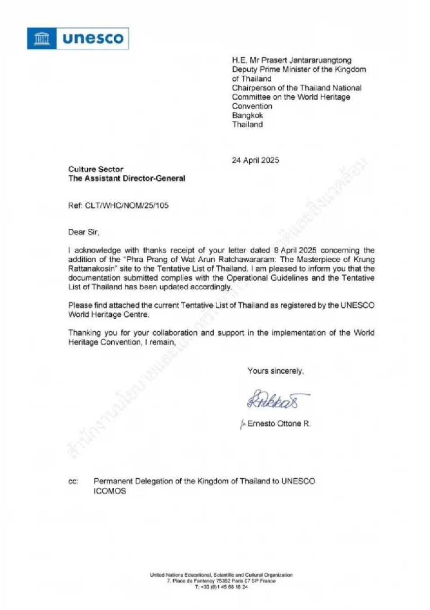 ข่าวดี! "ยูเนสโก" รับรอง "พระปรางค์วัดอรุณฯ" เข้าสู่บัญชีเบื้องต้น (Tentative list) แล้ว จากนั้นไทยจะต้องยื่นเอกสารเพื่อให้ก้าวสู่การเป็นมรดกโลก (World Heritage) ภายใน 5 ปีต่อไป