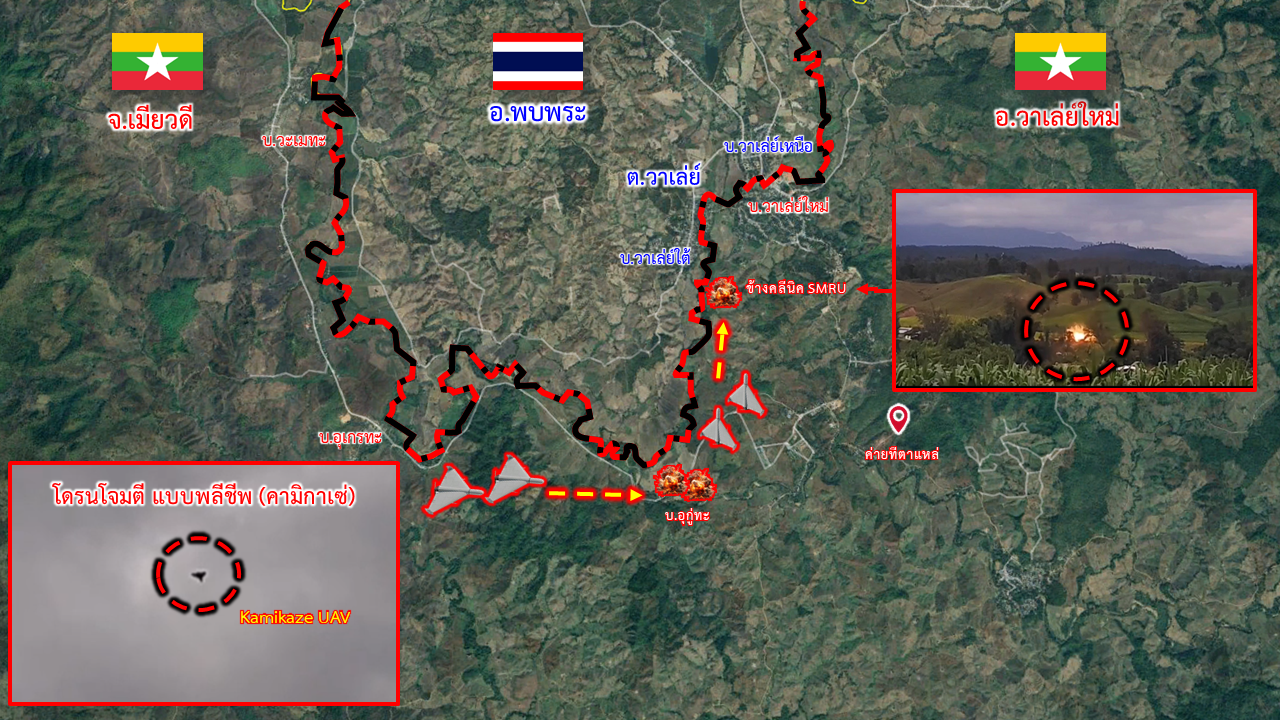 เมื่อเวลา 19.10 น. วันที่ 13 ก.ค.68 พ.อ.ณัฐกร เรือนติ๊บ ผู้บังคับการหน่วยเฉพาะกิจราชมนู (ผบ.ฉก.ราชมนู) เปิดเผยถึงการติดตามสถานการณ์การสู้รบชายแดนประเทศเมียนมา ว่า ทหารเมียนมาได้ใช้อากาศยานไร้คนขับโจมตีแบบพลีชีพ (โดรนคามิกาเซ่) จำนวน 4 ลำ พุ่งเข้าโจมตี ที่ตั้งของ กกล.KNLA และกลุ่มต่อต้าน ซึ่งวางกำลัง บริเวณข้างคลินิค SMRU และบริเวณพื้นที่ บ.อูกู่ทะ อ.วาเลย์ใหม่ จ.เมียวดี รัฐกะเหรี่ยง ประเทศเมียนมา ด้านตรงข้าม บ.วาเล่ย์ใต้ ม.2 ต.วาเล่ย์ อ.พบพระ จ.ตากห่างจากแนวชายแดน 500 เมตร ไม่มีผลกระทบต่อฝั่งไทย