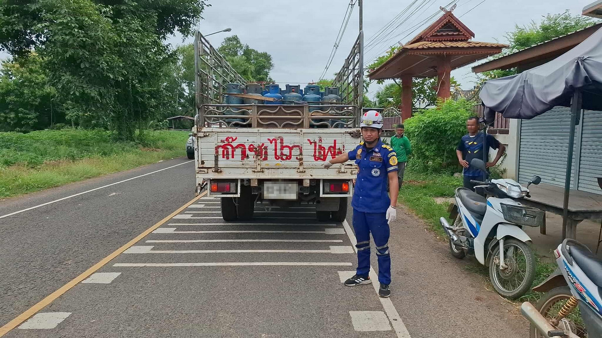 คุณลุงขี่รถจักรยานยนต์ชนกับรถบรรทุกแล้วโดนทับซ้ำ เสียชีวิตกลางถนนทางหลวงชนบท จ.บุรีรัมย์