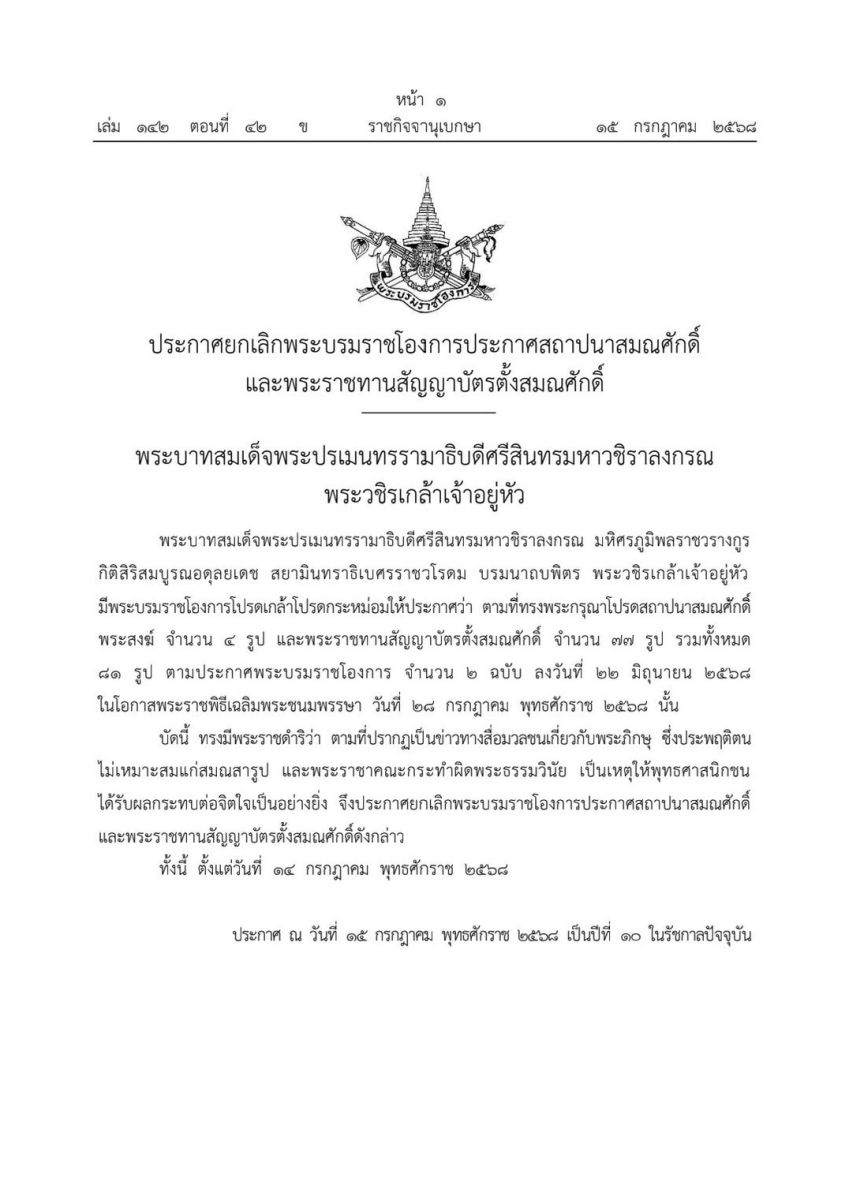 ราชกิจจานุเบกษา เผยแพร่ประกาศยกเลิกพระบรมราชโองการประกาศสถาปนาสมณศักดิ์และพระราชทานสัญญาบัตรตั้งสมณศักดิ์