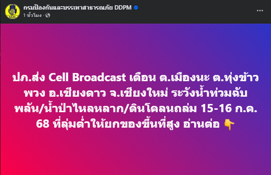 ปภ.ส่ง Cell Broadcast เตือน ต.เมืองนะ ต.ทุ่งข้าวพวง อ.เชียงดาว จ.เชียงใหม่ ระวังน้ำท่วมฉับพลัน/น้ำป่าไหลหลาก/ดินโคลนถล่ม 15-16 ก.ค. 68