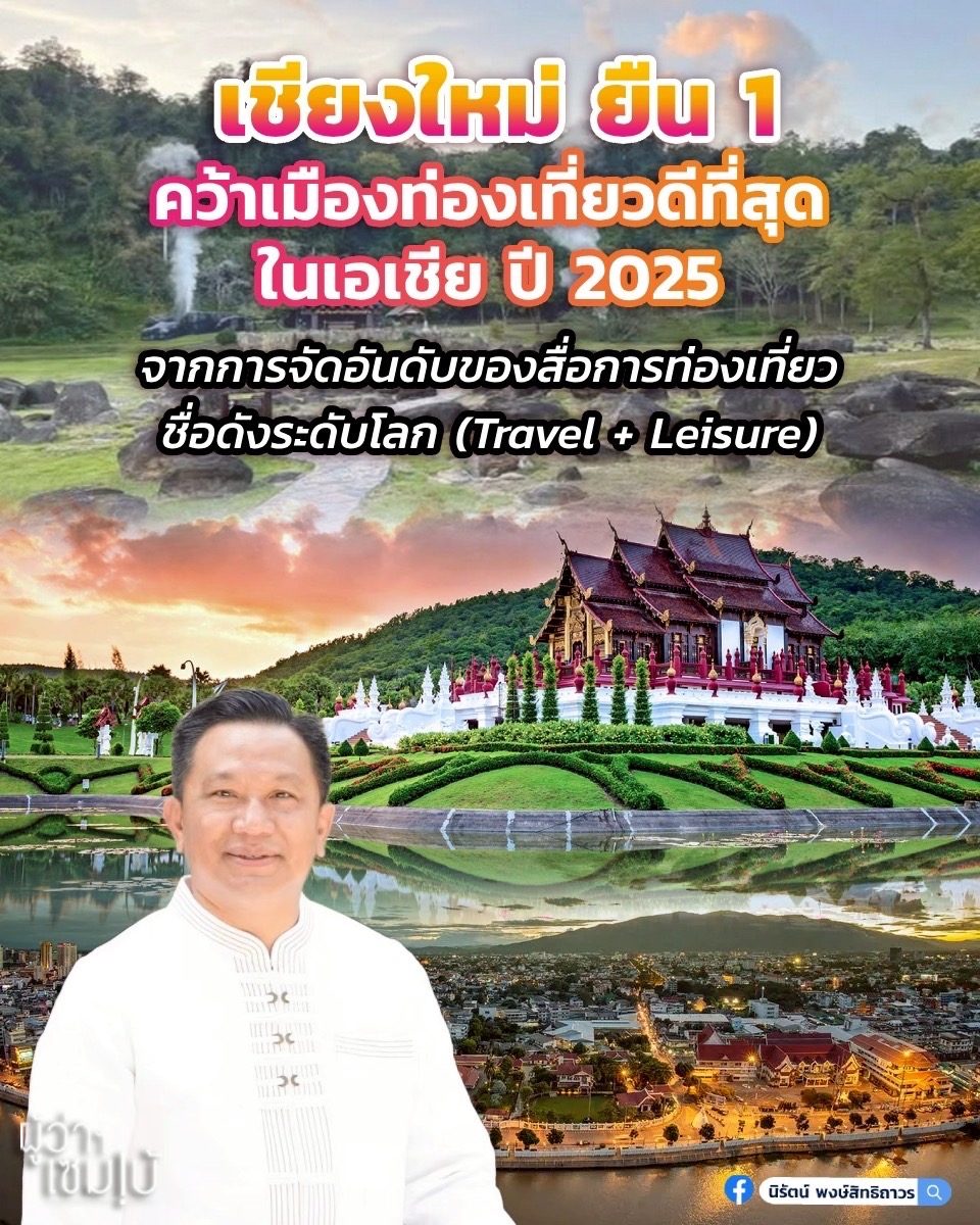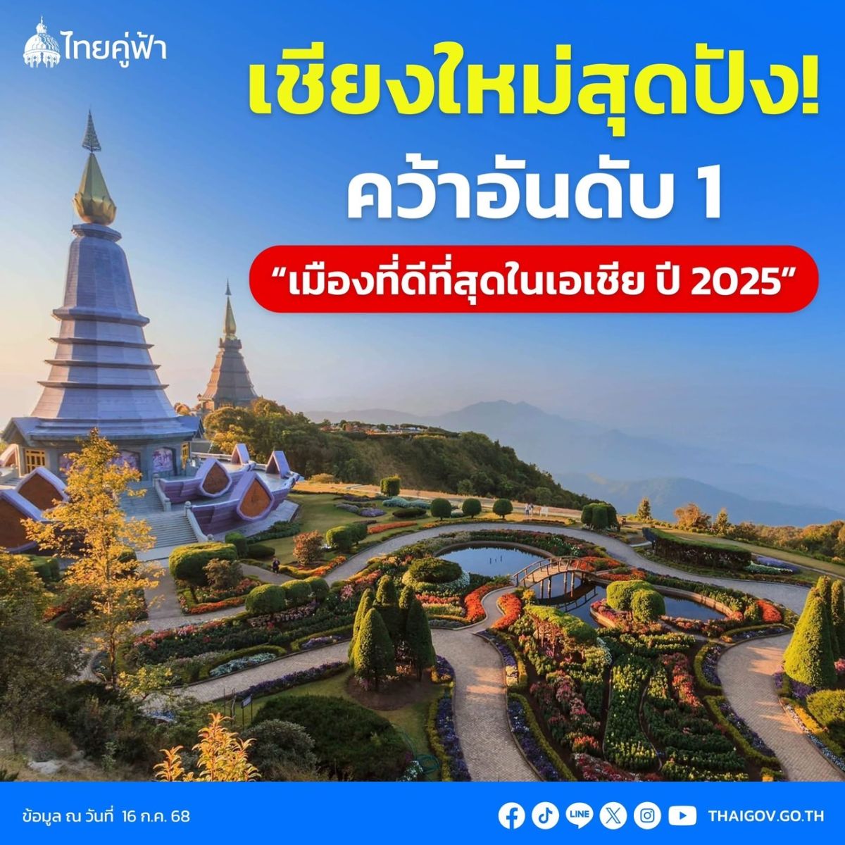 วันนี้ (16 ก.ค.68) นางสาวศศิกานต์ วัฒนะจันทร์ รองโฆษกประจำสำนักนายกรัฐมนตรี เปิดเผยว่า จากการจัดอันดับเมืองที่ดีที่สุดในภูมิภาคเอเชีย ประจำปี พ.ศ. 2568 โดยเว็บไซต์ Travel + Leisure แพลตฟอร์มด้านการท่องเที่ยวและไลฟ์สไตล์ชั้นนำของภูมิภาค พบว่า จังหวัดเชียงใหม่ ได้รับคะแนนสูงสุดเป็นอันดับ 1 ด้วยคะแนน 91.94 คะแนน ขณะที่กรุงเทพมหานคร ได้รับการจัดอันดับเป็นอันดับ 3 ด้วยคะแนน 91.34 คะแนน รองจากกรุงโตเกียว ประเทศญี่ปุ่น ซึ่งอยู่ในอันดับ 2 ด้วยคะแนน 91.39 คะแนน