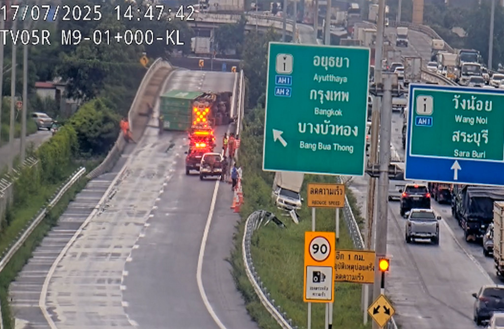 17 กรกฏาคม 2568 เวลา 14.08 น. เกิดอุบัติเหตุรถบรรทุกตู้คอนเทนเนอร์ เสียหลักพลิกตะแคงขวางถนน เหตุเกิดช่วงก่อนลงวงแหวนบางปะอิน เจ้าหน้าที่กำลังเร่งเคลื่อนย้าย วงแหวนกาญจนาภิเษก จากคลองหลวงมุ่งหน้าวังน้อย ล่าสุดรถบรรทุกตู้คอนเทนเนอร์พลิกตะแคงขวางถนน 2 ช่องทาง ส่งผลให้การจราจรที่กำลังมุ่งหน้าลงถนนพหลโยธิน (ขาเข้า) เพื่อข้ามสะพานบางปะอินไป บางบัวทอง อยุธยา รถไม่สามารถสัญจร จุดนี้เจ้าหน้าที่ได้ปิดจราจรเป็นการชั่วคราว โดยปัดรถให้ตรงวิ่งข้ามไปลงถนนพหลโยธิน ขาออก เพื่อระบายและผ่อนคลายจราจรติดขัดสะสม
