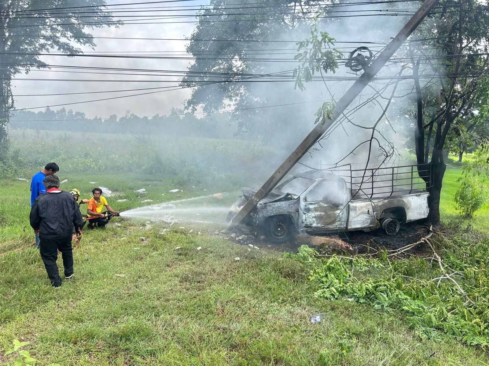 รถกระบะเสียหลักชนเสาไฟฟ้าริมถนนสาย โกสุมพิสัย-มหาสารคาม แล้วเกิดเพลิงลุกไหม้ทั้งคัน คนขับหนีตายรอดหวุดหวิด จ.มหาสารคาม