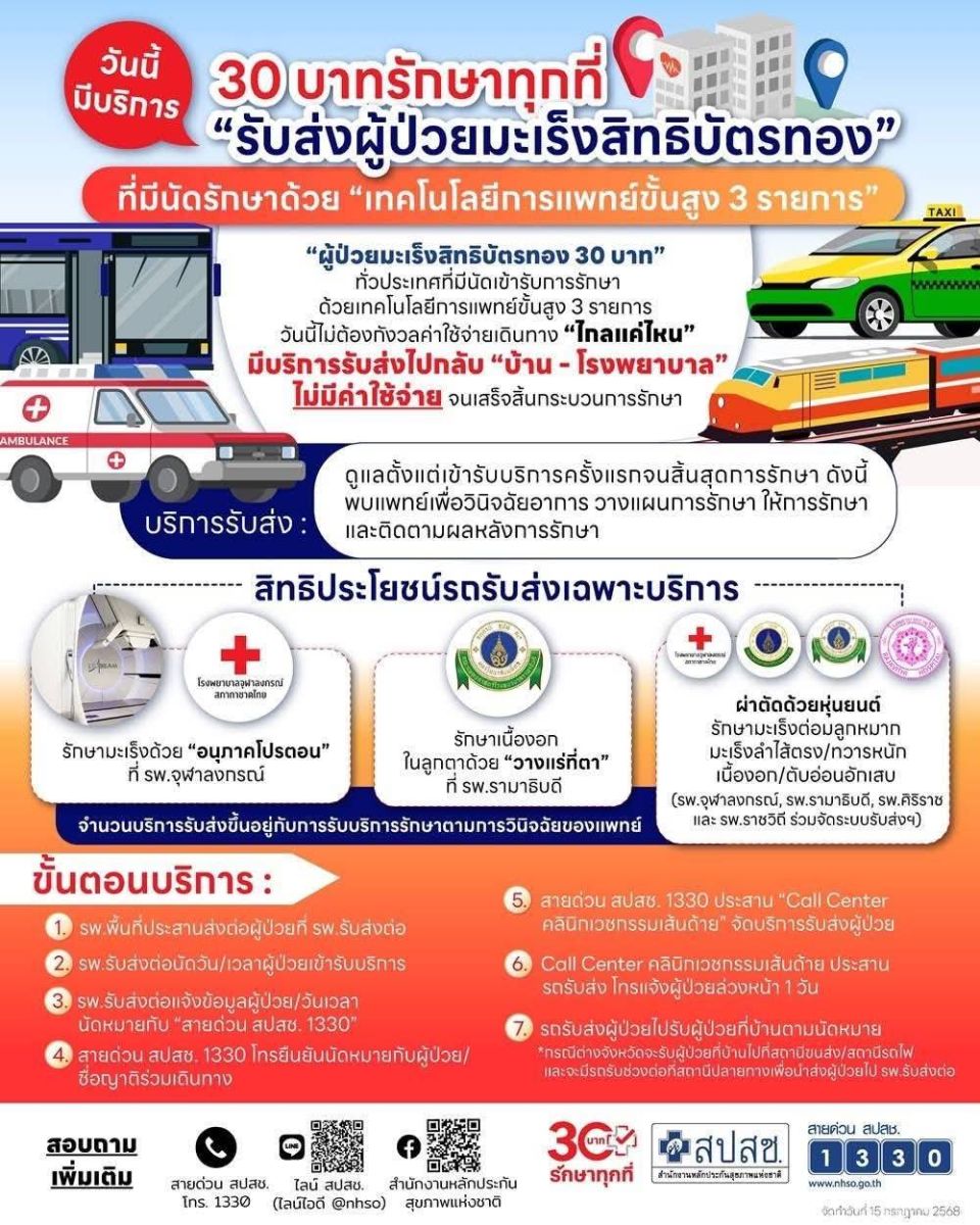 วันนี้(18 ก.ค.68) นางสาวตรีชฎา ศรีธาดา โฆษกกระทรวงสาธารณสุขฝ่ายการเมือง เปิดเผยถึงบริการใหม่ภายใต้นโยบาย “30 บาทรักษาทุกที่” โดยสำนักงานหลักประกันสุขภาพแห่งชาติ (สปสช.) จะจัดยานพาหนะรับส่งผู้ป่วยมะเร็งสิทธิบัตรทองฟรี สำหรับผู้ที่ต้องเดินทางเข้ารับการรักษาด้วยเทคโนโลยีการแพทย์ขั้นสูง 3 รายการ โดยจะอำนวยความสะดวกการเดินทางไป-กลับจากบ้านถึงโรงพยาบาลทั่วประเทศโดยไม่มีค่าใช้จ่าย นางสาวตรีชฎากล่าวว่า สิทธิประโยชน์รถรับส่งฟรีครอบคลุมการรักษา 3 รายการ ได้แก่: