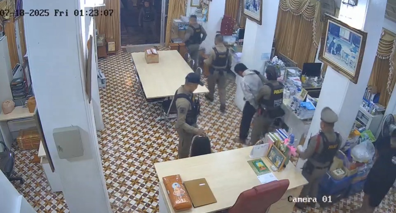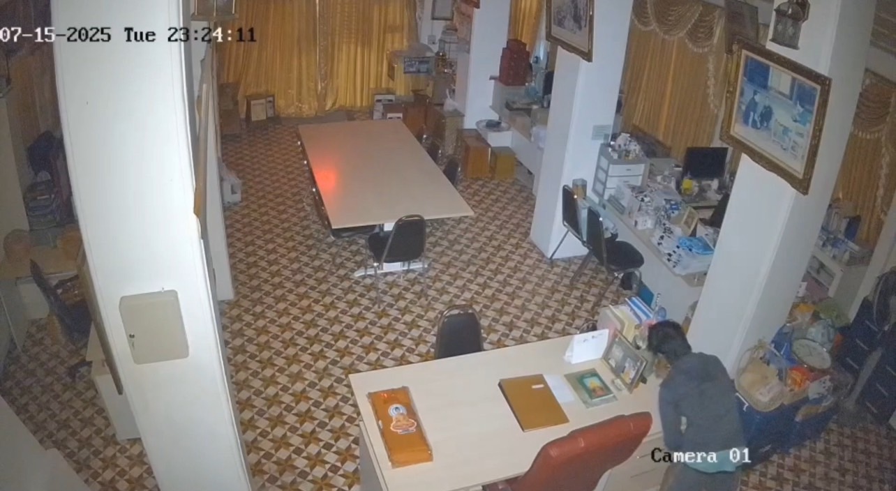 ขณะเดียวกัน ภาพจากกล้องวงจรปิด เมื่อวันที่ 15 ก.ค.68 เวลา 23:24 น. กล้องวงจรปิดบันทึกภาพ นายเอ นามสมมติ ปีนเข้ามาทางหน้าต่างก่อนจะเดินรื้อค้นทรัพย์สินภายในสำนักงานจนได้เงินไปจำนวนหนึ่งที่วางไว้บนโต๊ะก่อนจะหลบหนีไป และวันนี้ 18 ก.ค.68 กล้องวงจรปิดบันทึกภาพได้เวลา 00:55 น. นายเอ นามสมมติ ปีนเข้ามาทางหน้าต่างจุดเดิมก่อนจะเข้าไปโดยใช้ไฟฉายเดินส่องรื้อค้นทรัพย์สิน แต่ครั้งนี้ทางเจ้าหน้าที่วัดและพระได้พบเห็นจากกล้องวงจรปิดก่อนจึงแจ้งตำรวจเข้ามาจับกุมตัว ซึ่งคนร้ายจึงยังไม่ได้ทรัพย์สินมีค่าไป