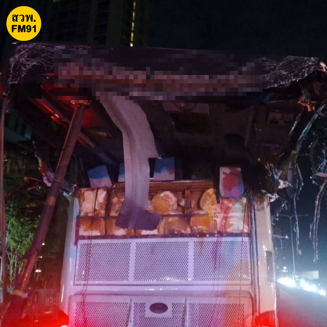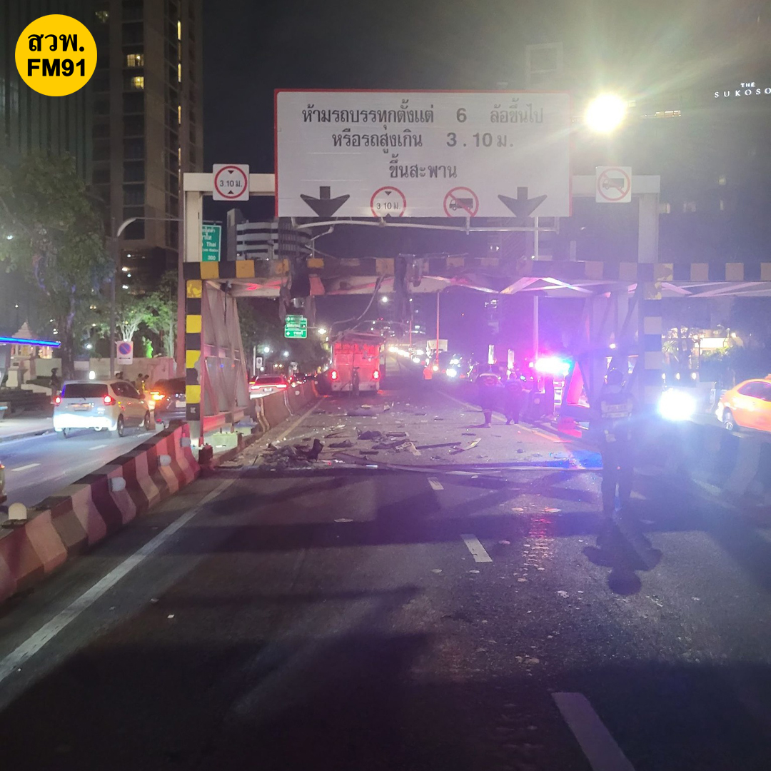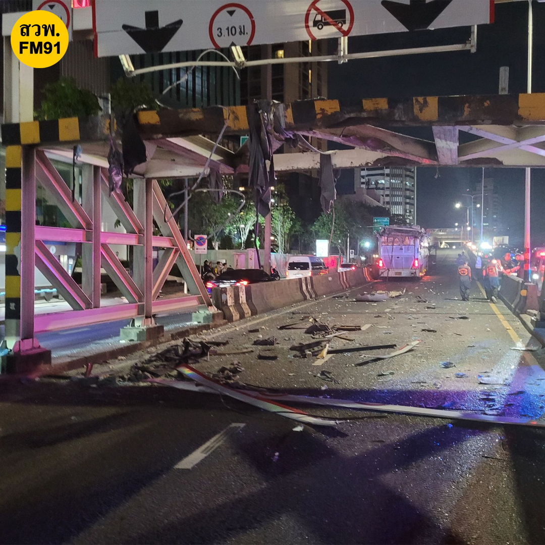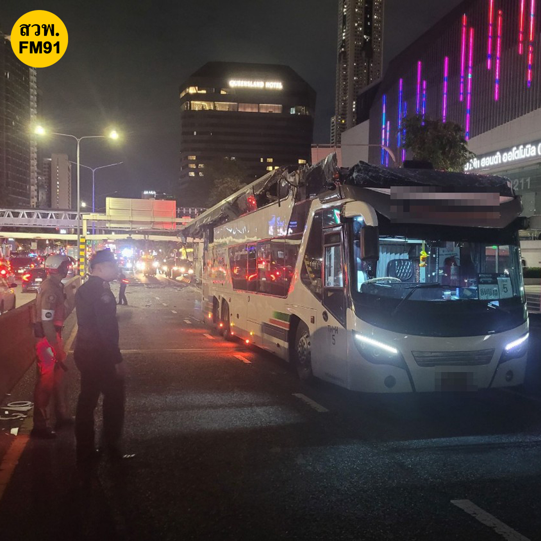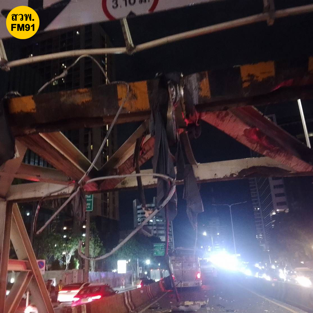 รถบัส 2 ชั้น ชนคานกั้นความสูง อยู่ระหว่างเคลื่อนย้าย ปิดสะพานข้ามแยกพญาไท (ชั่วคราว)