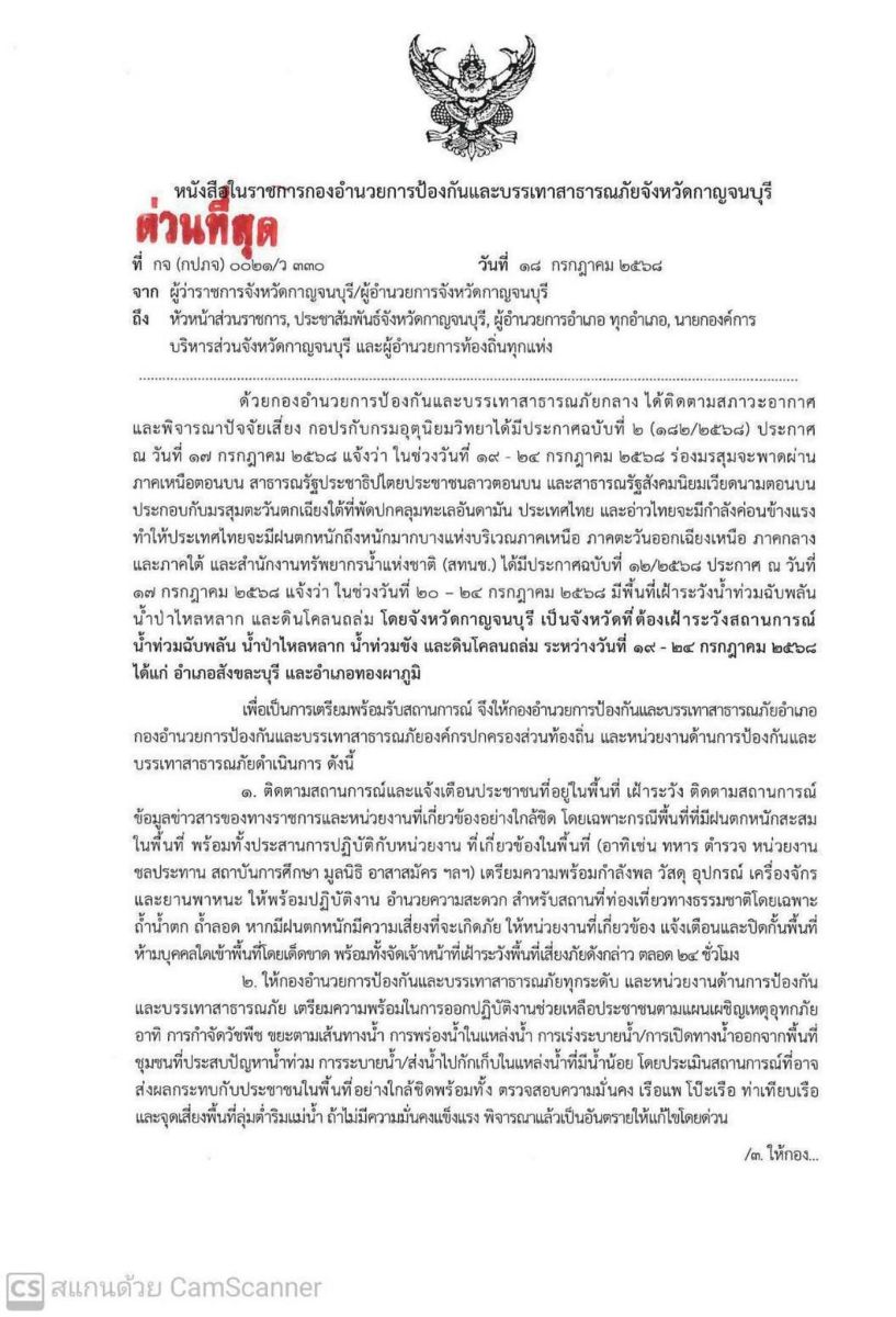 ผู้ว่าราชการจังหวัดกาญจนบุรีออกประกาศเตือนประชาชนในพื้นที่อำเภอสังขละบุรีและทองผาภูมิ ให้เฝ้าระวังสถานการณ์น้ำท่วมฉับพลัน น้ำป่าไหลหลาก และดินโคลนถล่มอย่างใกล้ชิด ระหว่างวันที่ 19-24 กรกฎาคมนี้ พร้อมสั่งการทุกหน่วยงานเตรียมความพร้อมรับมือและให้ความช่วยเหลือประชาชนตลอด 24 ชั่วโมง