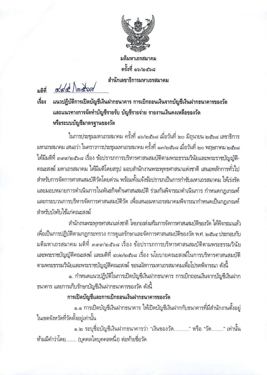 วันนี้ (19 ก.ค.68)สำนักงานพระพุทธศาสนาแห่งชาติ ออกคำสั่งอ้างถึงมติมหาเถรสมาคม เรื่อง แนวปฏิบัติการเปิดบัญชีเงินฝากธนาคาร การเบิกถอนเงินจากบัญชีเงินฝากธนาคารของวัด และแนวทางการจัดทำบัญชีรายรับ บัญชีรายจ่าย รายงานเงินคงเหลือของวัด หรือระบบบัญชีมาตรฐานของวัด