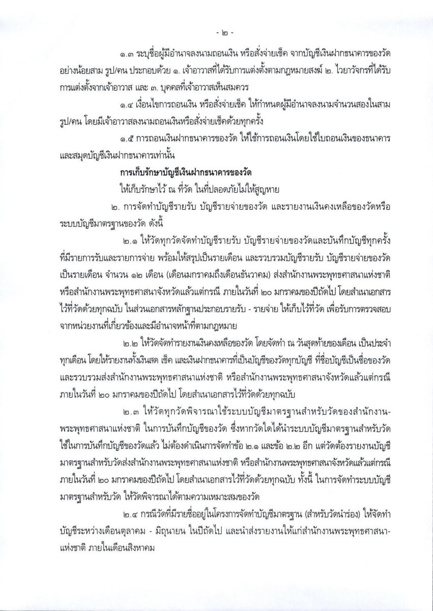 ๒.๓ ให้วัดทุกวัดพิจารณาใช้ระบบบัญชีมาตรฐานสำหรับวัดของสำนักงาน-พระพุทธศาสนาแห่งชาติ ในการบันทึกบัญชีของวัด ซึ่งหากวัดใดได้นำระบบบัญชีมาตรฐานสำหรับวัดใช้ในการบันทึกบัญชีของวัดแล้ว ไม่ต้องดำเนินการจัดทำข้อ ๒.๑ และข้อ ๒.๒ อีก แต่วัดต้องรายงานบัญชีมาตรฐานสำหรับวัดส่งสำนักงานพระพุทธศาสนาแห่งชาติ หรือสำนักงานพระพุทธศาสนาจังหวัดแล้วแต่กรณี ภายในวันที่ ๒๐ มกราคมของปีถัดไป โดยสำเนาเอกสารไว้ที่วัดด้วยทุกฉบับ ทั้งนี้ ในการจัดทำระบบบัญชีมาตรฐานสำหรับวัด ให้วัดพิจารณาได้ตามความเหมาะสมของวัด