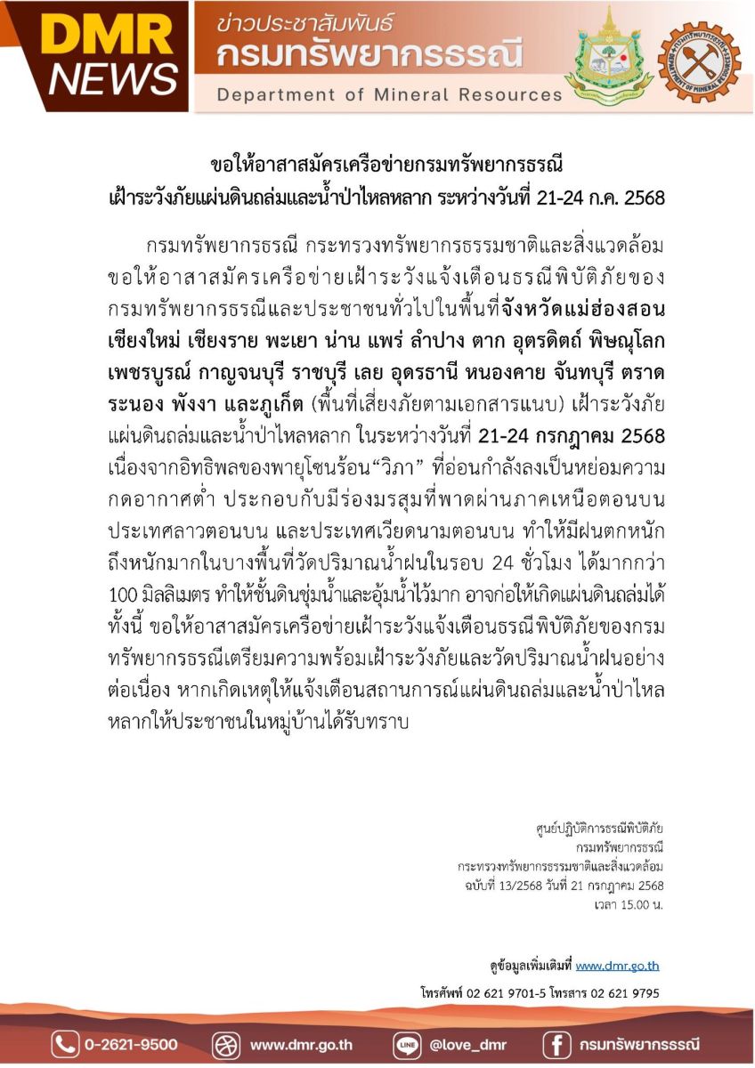 21 ก.ค. 2568 กรมทรัพยากรธรณี กระทรวงทรัพยากรธรรมชาติและสิ่งแวดล้อม ขอให้อาสาสมัครเครือข่ายในพื้นที่จังหวัดแม่ฮ่องสอน เชียงใหม่ เชียงราย พะเยา น่าน แพร่ ลำปาง ตาก อุตรดิตถ์ พิษณุโลก เพชรบูรณ์ กาญจนบุรี ราชบุรี เลย อุดรธานี หนองคาย จันทบุรี ตราด ระนอง พังงา และภูเก็ต เฝ้าระวังภัยแผ่นดินถล่มและน้ำป่าไหลหลาก ในระหว่างวันที่ 21-24 กรกฎาคม 2568 และขอให้เครือข่ายฯ ทธ. วัดปริมาณน้ำฝนอย่างต่อเนื่อง ทั้งนี้ ศูนย์ปฏิบัติการธรณีพิบัติภัย จะติดตามสถานการณ์อย่างใกล้ชิด