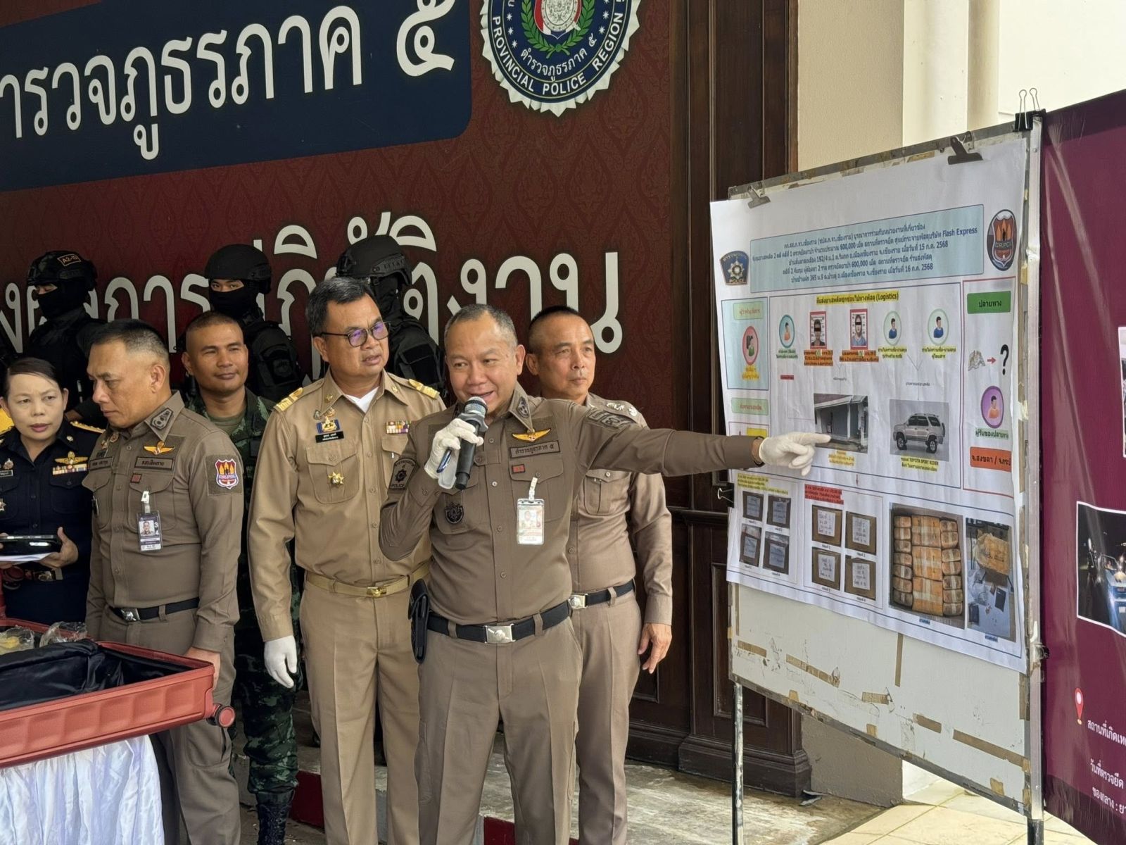 (21 ก.ค.68) ที่กองบังคับการสืบสวนสอบสวนตำรวจภูธรภาค 5 จังหวัดชียงใหม่ พลตำรวจโทกฤตธาพล ยี่สาคร ผู้บัญชาการตำรวจภูธรภาค 5 พร้อมด้วยผู้แทนฝ่ายทหาร,ฝ่ายปกครอง และสำนักงานป้องกันและปราบปรามยาเสพติด (ป.ป.ส.) ภาค 5 ร่วมกันแถลงผลการจับกุมผู้ต้องหาคดียาเสพติดรายสำคัญ จำนวน 5 คดี รวมของกลางยาบ้าทั้งหมด จำนวน 6,900,000 เม็ด ทั้งนี้คดีแรก เมื่อวันที่ 14 ก.ค.68 เจ้าหน้าที่ตำรวจ สภ.แม่สาย จ.เชียงราย บูรณาการร่วมหน่วยเกี่ยวข้อง จับกุมผู้ต้องหา 2 คน พร้อมของกลางยาบ้า จำนวน 1,200,000 เม็ด โดยก่อนการจับกุมเจ้าหน้าที่ตำรวจชุดจับกุมได้รับแจ้งจากสายลับว่ามีกลุ่มผู้ลำเลียงยาเสพติดจากพื้นที่แนวชายแดนในพื้นที่ อ.แม่สาย ไปส่งให้กลุ่มผู้ค้ายาเสพติดพื้นที่ตอนในโดยใช้เส้นทางรอง จึงได้รายงานให้ผู้บังคับบัญชาทราบตามลำดับชั้นและได้รับสั่งการให้ทำการตั้งจุดตรวจ/จุดสกัดในพื้นที่ ต.ห้วยไคร้ และ ต.โป่งงาม