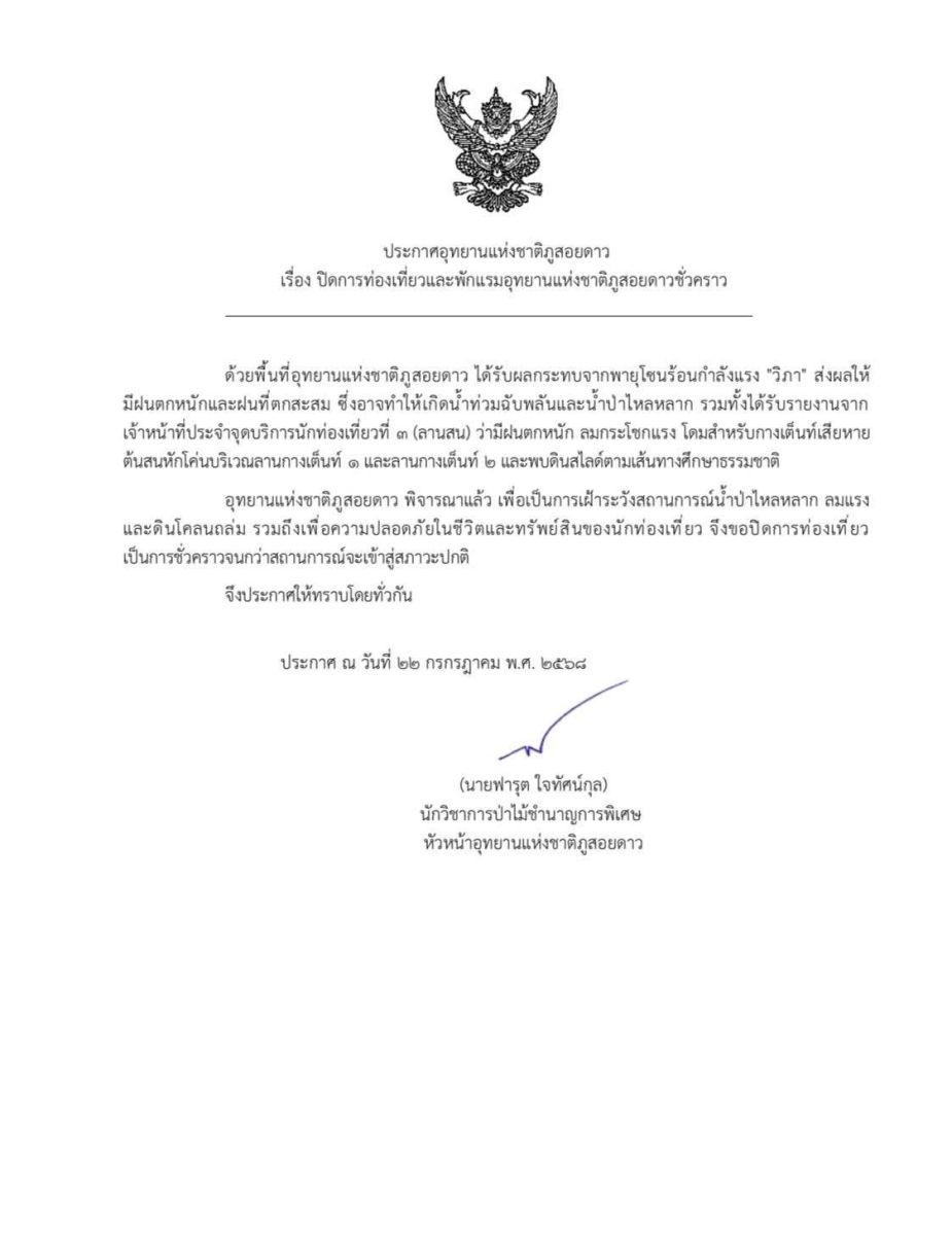 เมื่อเวลา 09.00 น. วันที่ 22 กรกฎาคม 2568 นายฟารุต ใจทัศน์กุล นักวิชาการป่าไม้ชำนาญการพิเศษ หัวหน้าอุทยานแห่งชาติภูสอยดาว ได้ออกประกาศอย่างเป็นทางการเรื่อง “การปิดการท่องเที่ยวและพักแรมในบริเวณลานสนเป็นการชั่วคราว” เพื่อเฝ้าระวังสถานการณ์อันตรายจากอิทธิพลของพายุโซนร้อน “วิภา” ซึ่งพัดผ่านภาคเหนือของประเทศไทยในช่วงนี้