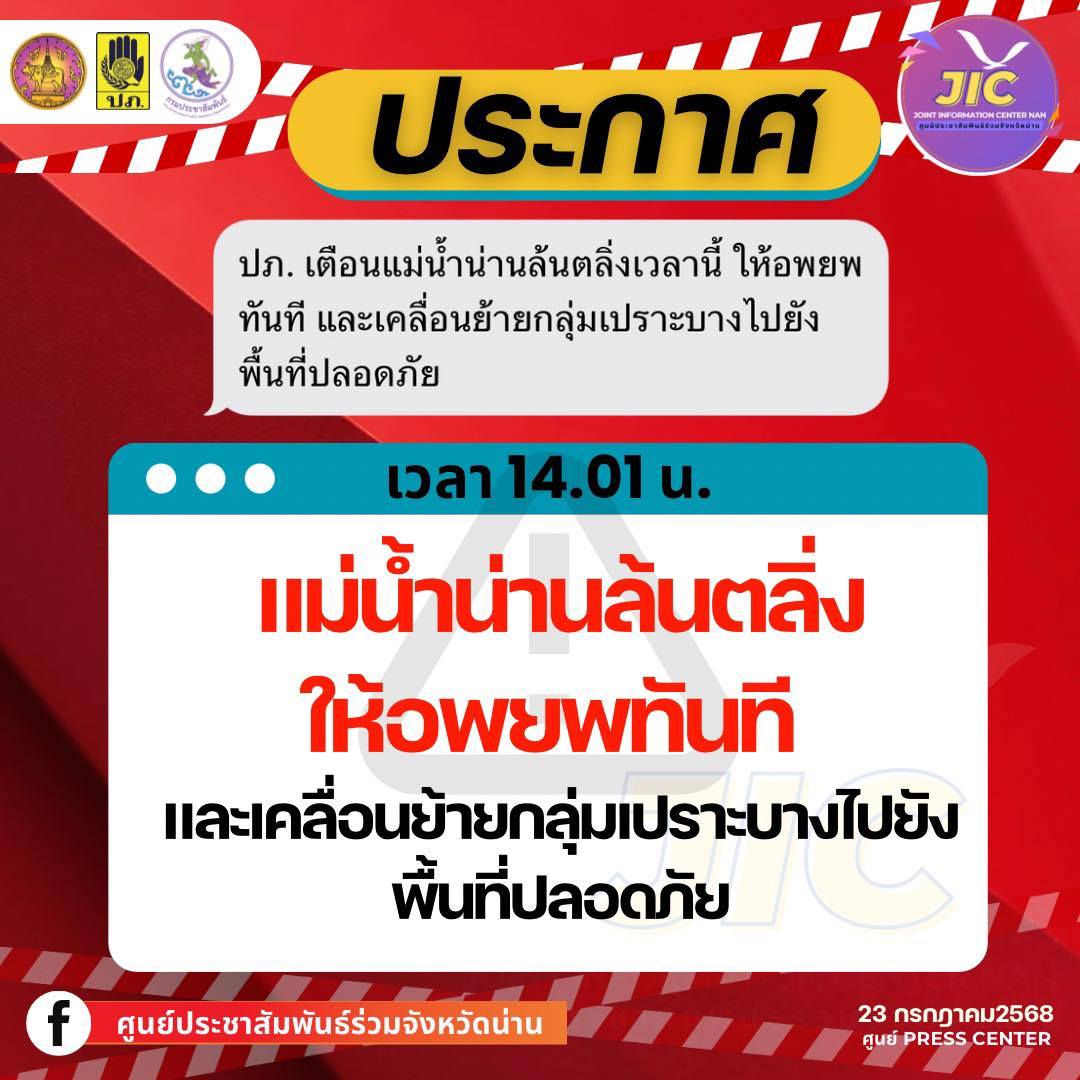 23 กรกฎาคม 2568 เพจ ศูนย์ประชาสัมพันธ์ร่วมจังหวัดน่าน รายการสถานการณ์น้ำที่สถานีวัดน้ำ N1 น้ำใกล้ล้นตลิ่งแล้ว จึงแจ้งเตือนด่วน ในเวลา 12.00 น.