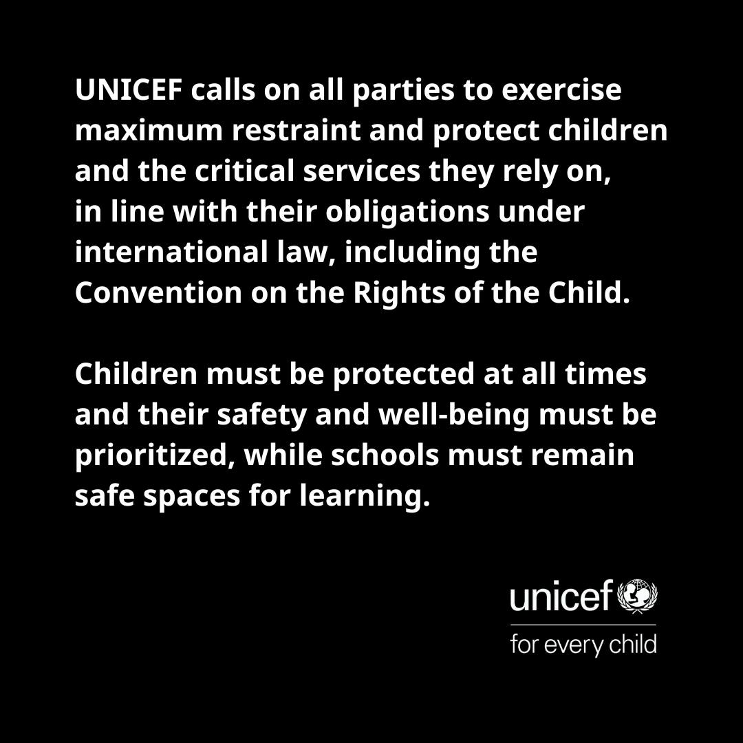 UNICEF calls on all parties to exercise maximum restraint and protect children and the critical services they rely on, in line with their obligations under international law, including the Convention on the Rights of the Child. Children must be protected at all times and their safety and well-being must be prioritized, while schools must remain safe spaces for learning.