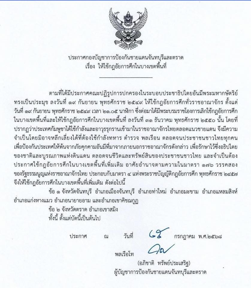 เมื่อวันที่ 25 กรกฎาคม กองบัญชาการป้องกันชายแดนจันทบุรีและตราด เรื่องให้ใช้กฎอัยการศึกในบางเขตพื้นที่ ความว่า ตามที่ได้มีประกาศคณะปฏิรูปการปกครองในระบอบประชาธิปไตยอันมีพระมหากษัตริย์ ทรงเป็นประมุข ลงวันที่ 19 กันยายน พุทธศักราช 2549 ให้ใช้กฎอัยการศึกทั่วราชอาณาจักร ตั้งแต่ วันที่ 19 กันยายน 2549 เวลา 21.05 น.ซึ่งต่อมาได้มีพระบรมราชโองการเลิกใช้กฎอัยการศึก ในบางเขตพื้นที่และให้ใช้กฎอัยการศึกในบางเขตพื้นที่ ลงวันที่ 31 ธันวาคม พุทธศักราช 2550 นั้น