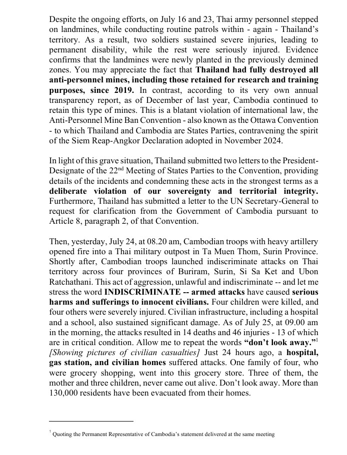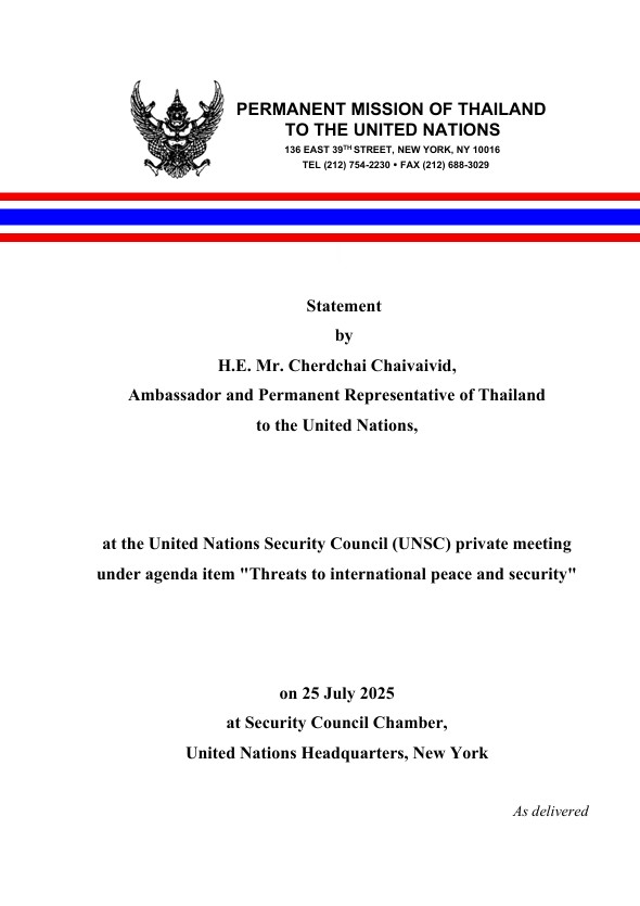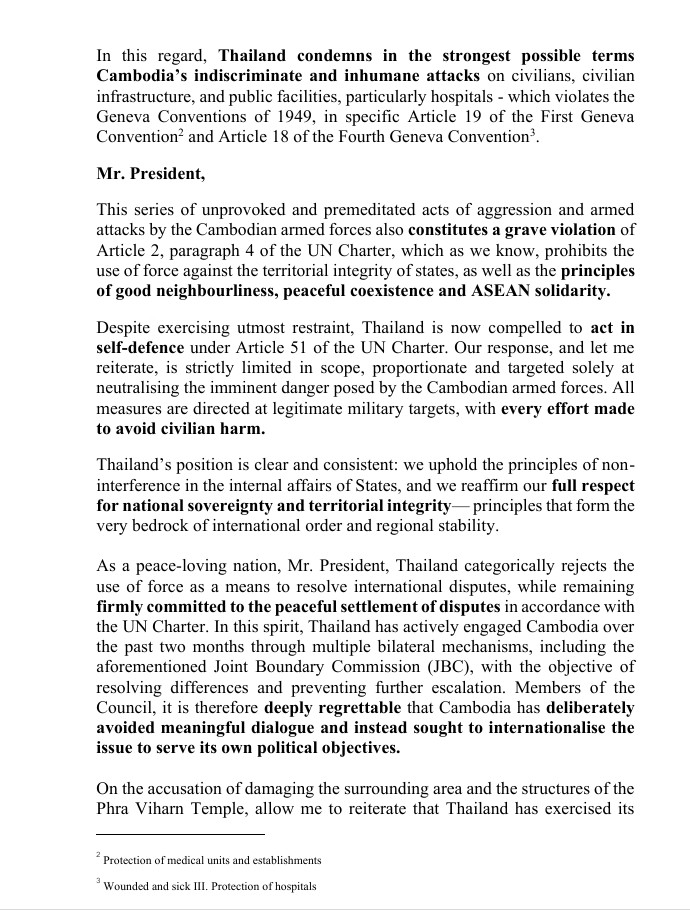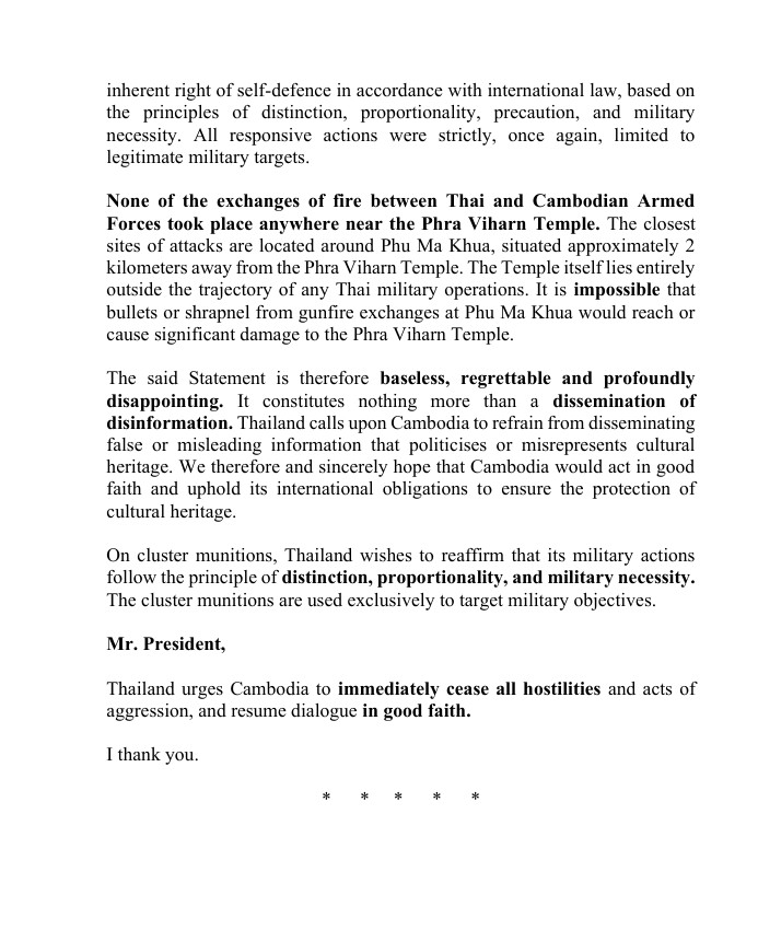 ในฐานะประเทศที่รักสันติ ประเทศไทยปฏิเสธการใช้กำลังเป็นวิธีการแก้ไขข้อพิพาทระหว่างประเทศอย่างเด็ดขาด โดยยังคงมุ่งมั่นอย่างแน่วแน่ต่อการระงับข้อพิพาทอย่างสันติ โดยสอดคล้องกับกฎบัตรสหประชาชาติ ในช่วงสองเดือนที่ผ่านมา ประเทศไทยได้มีส่วนร่วมอย่างแข็งขันกับกัมพูชาผ่านกลไกทวิภาคีหลายประการ รวมถึงคณะกรรมาธิการร่วมชายแดน (JBC) ดังกล่าว โดยมีวัตถุประสงค์เพื่อแก้ไขความแตกต่างและป้องกันการยกระดับ ดังนั้น คณะมนตรีจึงเสียใจอย่างยิ่งที่กัมพูชา จงใจบ่อนทำลายการเจรจาที่มีความหมาย และพยายามทำให้ปัญหาเป็นสากลเพื่อบรรลุวัตถุประสงค์ของตนเอง
