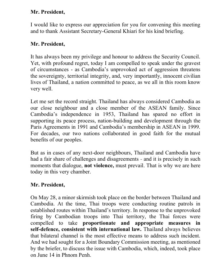 เป็นสิทธิพิเศษและเกียรติยศของผมเสมอมาที่ได้กล่าวต่อคณะมนตรีความมั่นคง อย่างไรก็ตาม ด้วยความเสียใจอย่างสุดซึ้ง วันนี้ผมถูกบังคับให้ต้องกล่าวถึงสถานการณ์ที่ร้ายแรงที่สุด – การรุกรานที่ไม่มีการยั่วยุจากกัมพูชาคุกคามอธิปไตย บูรณภาพแห่งดินแดน และที่สำคัญที่สุดคือชีวิตของพลเรือนผู้บริสุทธิ์ของประเทศไทย ซึ่งเป็นประเทศที่มุ่งมั่นในสันติภาพ ดังที่พวกเราทุกคนในห้องนี้ทราบดี