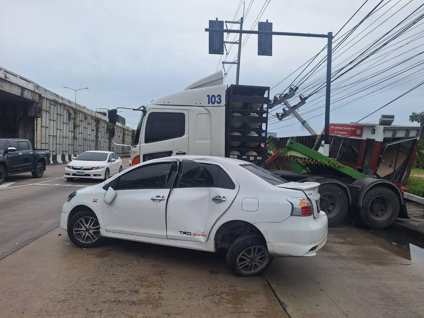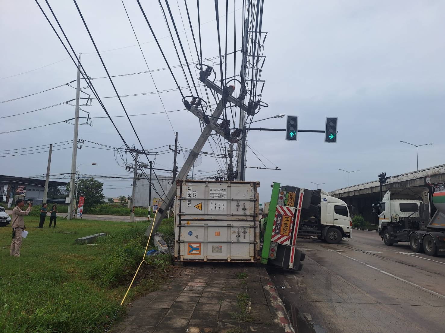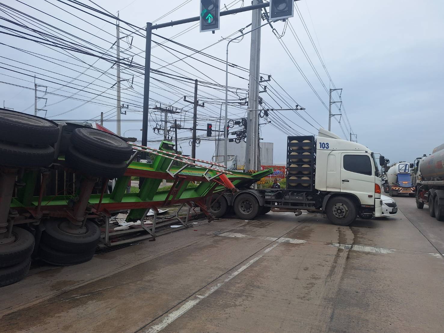 อุบัติเหตุ เมื่อเวลา 06.00 น. ที่ผ่านมา ถนนคู่ขนานมอเตอร์เวย์ มุ่งหน้าพัทยา ที่แยกไฟแดงหนองยายบู่ รถเทรลเลอร์เสียหลัก หางพลิกคว่ำ เฉี่ยวชนรถนั่งส่วนบุคคลและป้อมตำรวจ ขวางการจราจรช่องซ้ายสุด เจ้าหน้าที่อยู่ระหว่างดำเนินการเคลื่อนย้าย