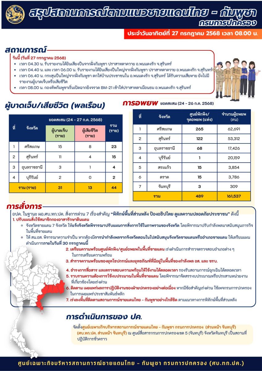 วันที่ 27 กรกฎาคม 2568 กรมการปกครองสรุปสถานการณ์ตามแนวชายแดนไทย-กัมพูชา โดยมีไทม์ไลน์ดังนี้