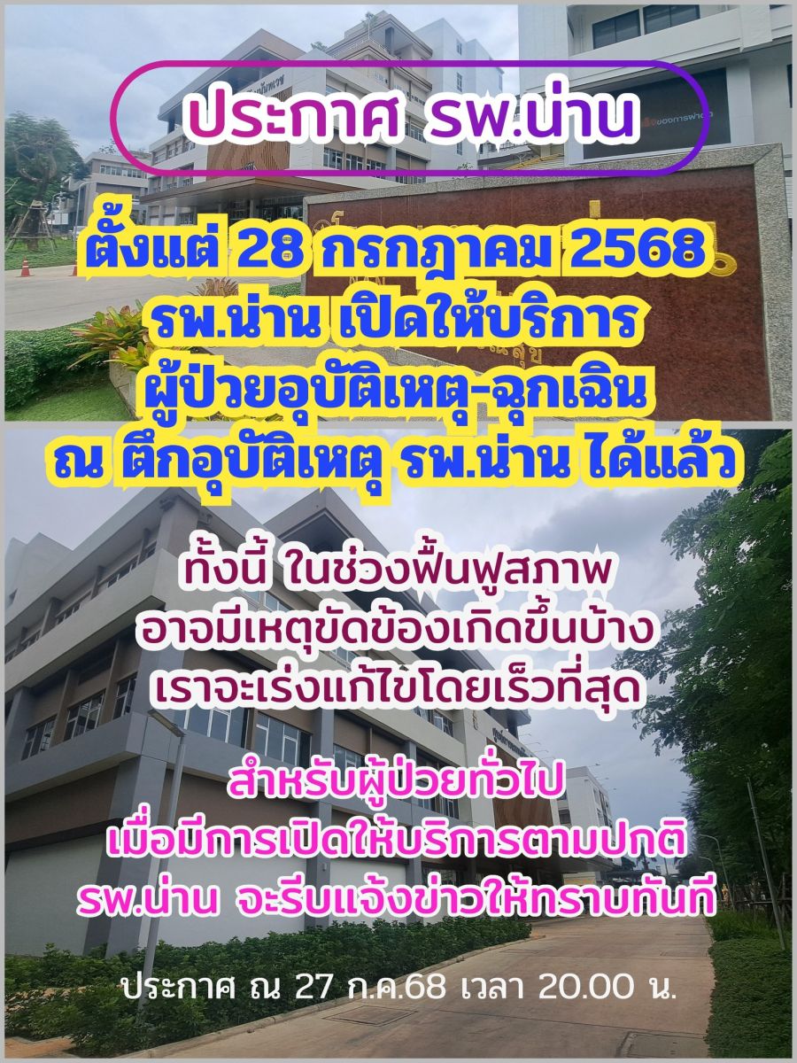 ล่าสุด โรงพยาบาลน่าน ออกประกาศในเวลา 20.00 น. ว่าตั้งแต่ 28 กรกฎาคม 2568 เป็นต้นไป รพ.น่าน เปิดให้บริการผู้ป่วยอุบัติเหตุ-ฉุกเฉิน ณ ตึกอุบัติเหตุ รพ.น่าน ได้แล้ว