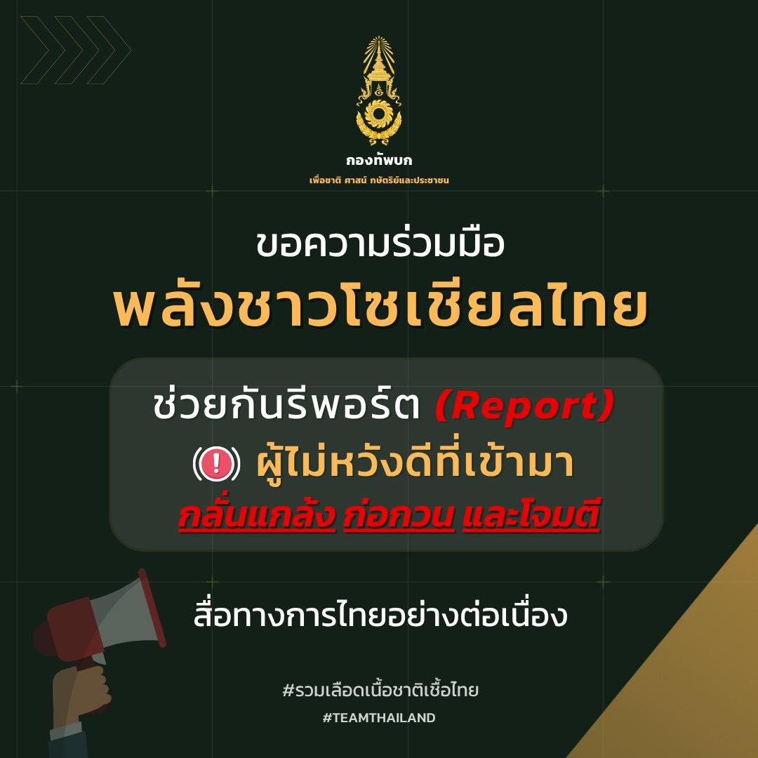 วันที่ 28 กรกฎาคม 2568 กองทัพบก ขอความร่วมมือพลังโซเชียลชาวไทย ช่วยกันกดรีพอร์ต Report โพสต์หรือคอมเมนต์ในโลกออนไลน์ ของ “ผู้ไม่หวังดี” ที่ต้องการเข้ามากลั่นแกล้ง ก่อกวน โจมจี สื่อทางการของไทย ท่ามกลางความไม่สงบในสถานการณ์ชายแดนไทย-กัมพูชา
