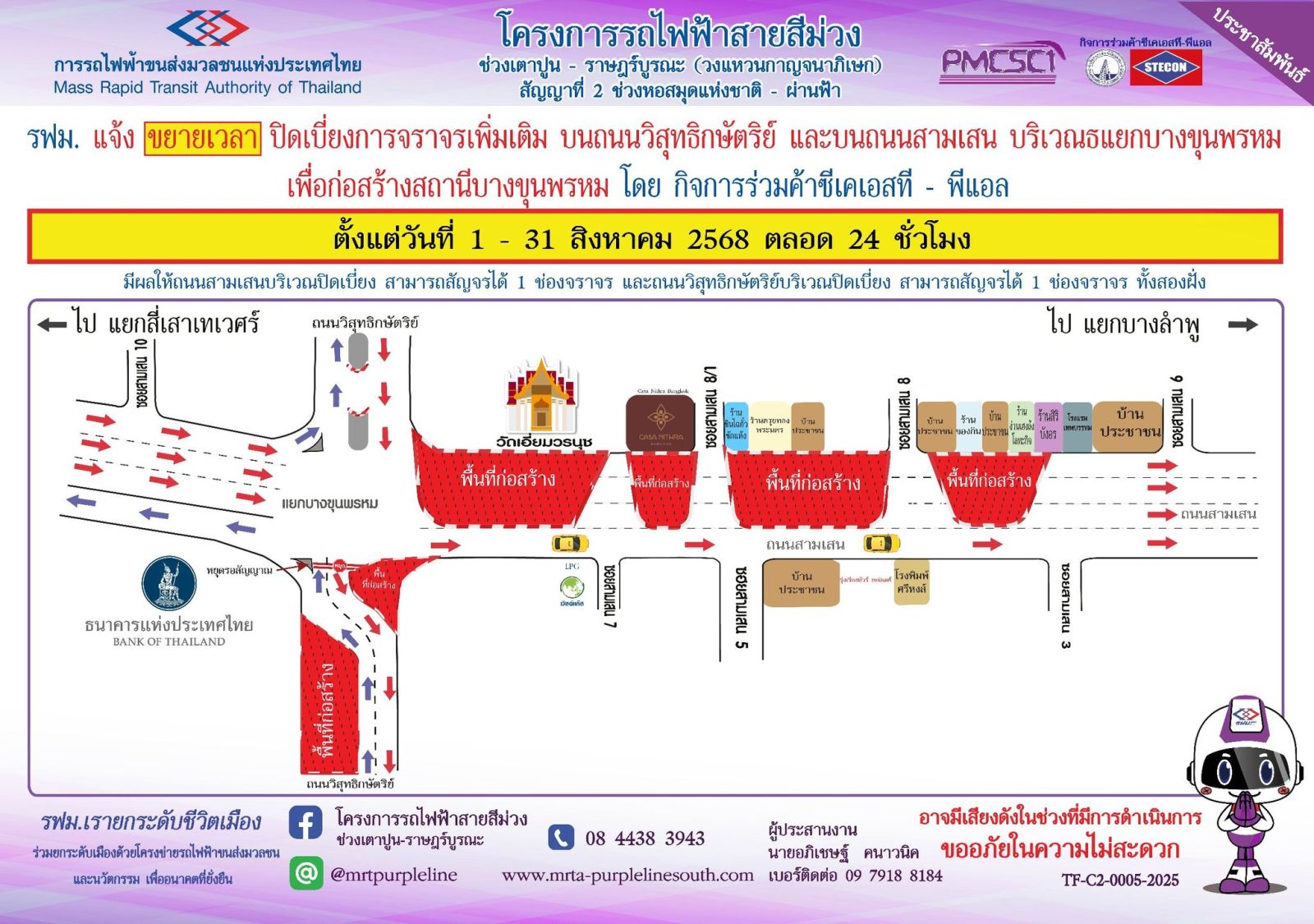 รฟม. แจ้งขยายเวลาปิดเบี่ยงจราจรเพิ่มเติม บนถนนวิสุทธิกษัตริย์ และถนนสามเสน บริเวณแยกบางขุนพรหม เพื่อก่อสร้างสถานีบางขุนพรหม โครงการรถไฟฟ้าสายสีม่วง ช่วงเตาปูน - ราษฎร์บูรณะ (วงแหวนกาญจนาภิเษก) ตั้งแต่วันที่ 1 – 31 สิงหาคม 2568 ตลอด 24 ชั่วโมง