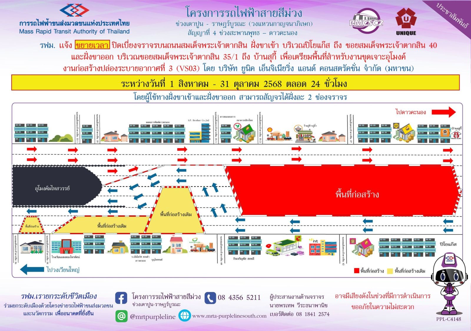รฟม. แจ้งขยายเวลาปิดเบี่ยงจราจรบนถนนสมเด็จพระเจ้าตากสิน ฝั่งขาเข้า บริเวณปิโยแก๊ส ถึง ซอยสมเด็จพระเจ้าตากสิน 40 และฝั่งขาออก บริเวณซอยสมเด็จพระเจ้าตากสิน 35/1 ถึง บ้านสุกี้ เพื่อเตรียมพื้นที่สำหรับงานขุดเจาะอุโมงค์ งานก่อสร้างปล่องระบายอากาศที่ 3 (VS03) โครงการรถไฟฟ้าสายสีม่วง ช่วงเตาปูน - ราษฎร์บูรณะ (วงแหวนกาญจนาภิเษก) ระหว่างวันที่ 1 สิงหาคม – 31 ตุลาคม 2568 ตลอด 24 ชั่วโมง