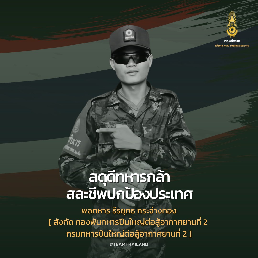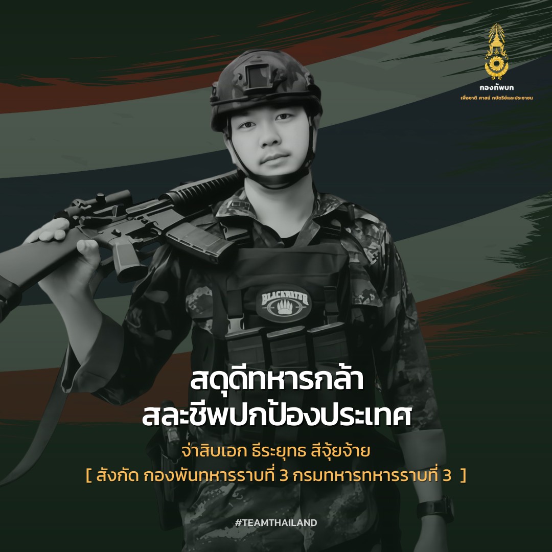 กองทัพบกขอสดุดีแด่กำลังพลผู้เสียชีวิตจากการปฏิบัติหน้าที่ปกป้องอธิปไตยของชาติ และจะดูแลสิทธิและสวัสดิการแก่ครอบครัวและทายาทของทหารกล้าเหล่านี้ให้ดีที่สุด เพื่อเป็นการเชิดชูเกียรติแห่งความเสียสละของท่านเหล่านี้ (ตั้งแต่วันที่ 24 ก.ค.68 ถึงปัจจุบัน รวมกำลังพลเสียชีวิต 14 นาย)