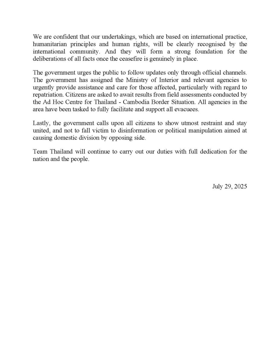 สุดท้ายนี้ ขอให้พี่น้องประชาชน ไม่ตกเป็นเหยื่อเกมข่าวลวง หรือเกมการเมืองของกัมพูชา เพื่อสร้างความแตกแยก ภายในประเทศจากฝ่ายตรงข้าม ทีมประเทศไทยขอยืนยันว่าจะปฏิบัติหน้าที่อย่างเต็มกําลัง เพื่อรักษาผลประโยชน์ของ ประเทศชาติ และพี่น้องประชาชน