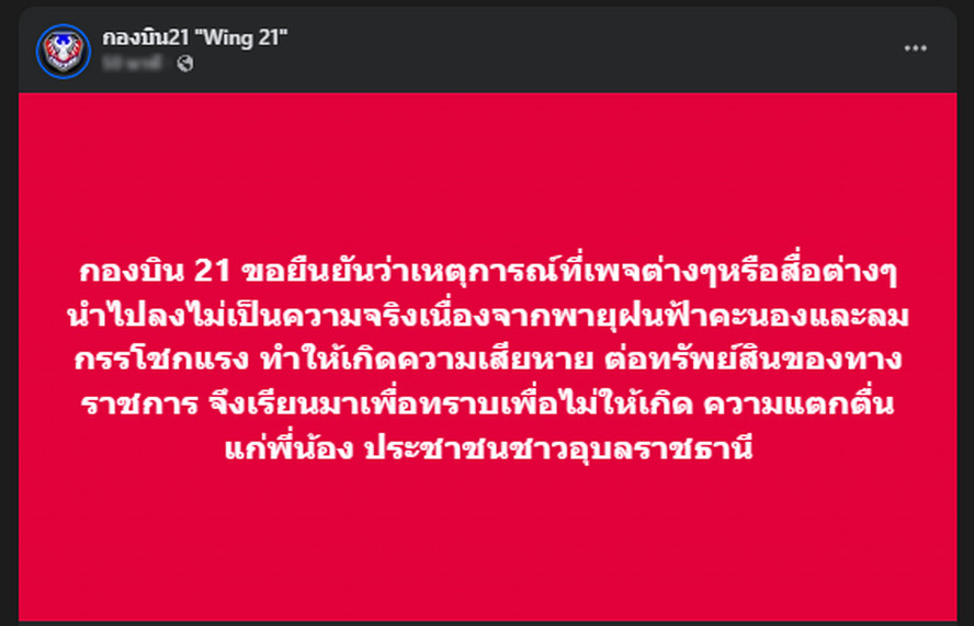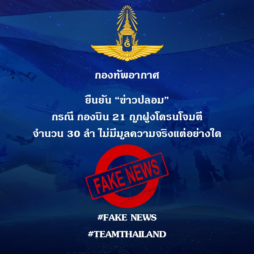 กองทัพอากาศ ยืนยัน "ข่าวปลอม" กองบิน 21 ไม่ได้ถูกฝูงโดรนโจมตีแต่อย่างใด ความจริงที่ปรากฎ คือ เกิดเหตุพายุฝนฟ้าคะนอง และลมกระโชกแรง ทำให้เกิดความเสียหายต่อทรัพย์สินของทางราชการ