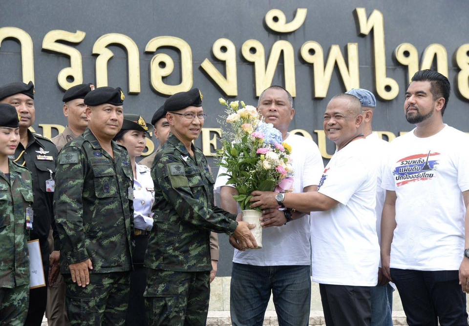 คณะรวมพลังแผ่นดินฯ รวมตัวมอบดอกไม้ ให้กำลังใจ ทหาร 3 เหล่าทัพ ปกป้องดินแดนไทย - กัมพูชา ผ่าน กองบัญชาการทหารไทย