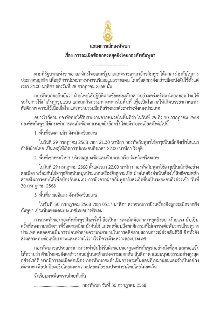 The Royal Thai Army strongly condemns the irresponsible actions of the Cambodian Armed Forces and affirms its commitment to upholding the highest principles of restraint, peace, and humanity. Nevertheless, should violations continue, the Royal Thai Army will take appropriate and necessary measures decisively to protect Thai sovereignty and the safety of Thai citizens without exception.