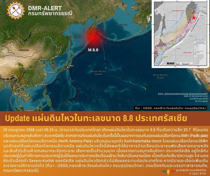 30 กรกฎาคม 2568 ศูนย์ปฏิบัติการธรณีพิบัติภัย กรมทรัพยากรธรณี กระทรวงทรัพยากรธรรมชาติและสิ่งแวดล้อม (ทส.) แจ้งเตือนเหตุแผ่นดินไหวเมื่อเวลา 06.24 น. (ตามเวลาในประเทศไทย) เกิดแผ่นดินไหวในทะเลขนาด 8.8 ที่ระดับความลึก 20.7 กิโลเมตร บริเวณคาบสมุทรคัมชัตกา ประเทศรัสเซีย