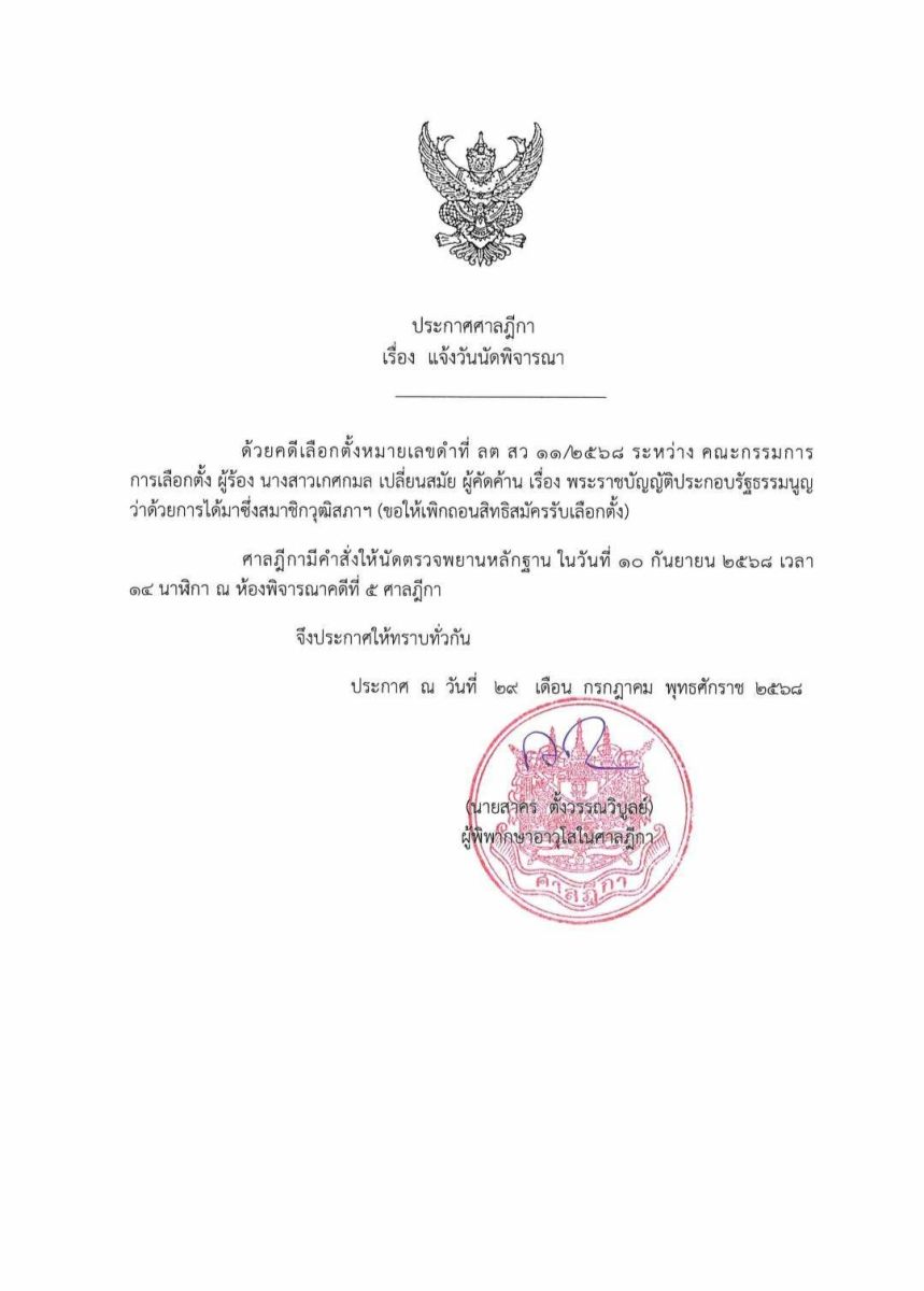จากกรณีคณะกรรมการการเลือกตั้ง (กกต.) ยื่นคำฟ้องต่อศาลฎีกาเมื่อวันที่ 24 กรกฎาคม 2568 ขอให้สั่งให้เพิกถอนสิทธิสมัครรับเลือกตั้งหรือเพิกถอนสิทธิเลือกตั้ง ของนางสาวเกศกมล เปลี่ยนสมัย สมาชิกวุฒิสภา ตาม พ.ร.ป.ว่าด้วยการได้มาซึ่งสมาชิกวุฒิสภา 2561 มาตรา 62 ประกอบประกอบมาตรา77(4) และรัฐธรรมนูญมาตรา 226 นั้น