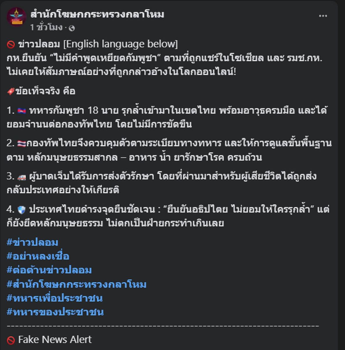 31 กรกฎาคม 2568 สำนักโฆษกกระทรวงกลาโหม โต้ข่าวปลอม โดยกระทรวงกลาโหม (กห.) ยืนยัน “ไม่มีคำพูดเหยียดกัมพูชา” ตามที่ถูกแชร์ในโซเชียล และ พลเอก ณัฐพล นาคพาณิชย์ รัฐมนตรีช่วยว่าการกระทรวงกลาโหม ไม่เคยให้สัมภาษณ์อย่างที่ถูกกล่าวอ้างในโลกออนไลน์ ข้อเท็จจริง คือ