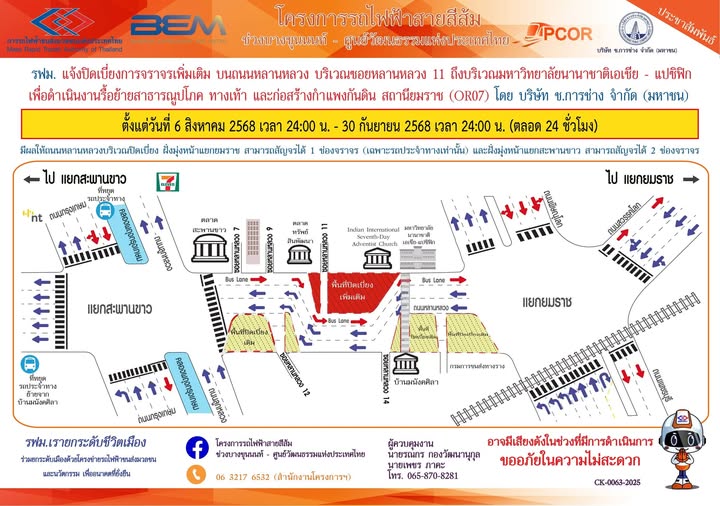 รฟม. แจ้งปิดเบี่ยงการจราจรเพิ่มเติม บนถนนหลานหลวง บริเวณซอยหลานหลวง 11 ถึงบริเวณมหาวิทยาลัยนานาชาติเอเซีย - แปซิฟิก เพื่อดำเนินงานรื้อย้ายสาธารณูปโภค ทางเท้า และก่อสร้างกำแพงกันดิน สถานียมราช (OR07) โครงการรถไฟฟ้าสายสีส้ม ช่วงบางขุนนนท์ - ศูนย์วัฒนธรรมแห่งประเทศไทย ตั้งแต่วันที่ 6 สิงหาคม 2568 เวลา 24:00 น. – 30 กันยายน 2568 เวลา 24.00 น. (ตลอด 24 ชั่วโมง)