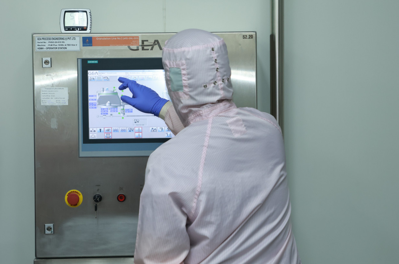 วัตถุดิบที่ชั่งอย่างแม่นยำแล้วจะถูกตรวจสอบความถูกต้องอีกครั้งก่อนนำเข้าสู่การขึ้นรูปแกรนูลแบบต่อเนื่อง ผ่านเครื่องจักรที่ออกแบบมาเฉพาะได้แก่ เครื่องผสมผงยา เครื่องอบแห้งแบบลอยตัว และเครื่องบดลดขนาด ซึ่งทำงานภายใต้ระบบปิดเพื่อควบคุมสภาพแวดล้อมและป้องกันการปนเปื้อน กระบวนการนี้ช่วยให้วัตถุดิบทั้งหมดถูกผสมเข้ากันอย่างสม่ำเสมอและช่วยปรับปรุงคุณสมบัติให้เหมาะสมสำหรับการอัดขึ้นรูปผงยาที่ผ่านเกณฑ์การทดสอบจะถูกลำเลียงเข้าสู่ขั้นตอนการขึ้นรูปเม็ดยา กระบวนการนี้ใช้เครื่องจักรอัดขึ้นรูปให้ได้เม็ดยาที่มีขนาด รูปร่าง และปริมาณตัวยาที่ถูกต้องตามที่กำหนดไว้ เม็ดยาที่ขึ้นรูปแล้วจะถูกลำเลียงผ่านเครื่องกำจัดฝุ่น ทำหน้าที่ขจัดเศษฝุ่นหรืออนุภาคส่วนเกินที่อาจตกค้างจากกระบวนการขึ้นรูป จากนั้นเม็ดยาจะถูกลำเลียงผ่านเครื่องตรวจจับโลหะเพื่อป้องกันการปนเปื้อนของโลหะจากกระบวนการผลิต แล้วจึงนำไปเคลือบผิวโดยสารเคลือบจะถูกเลือกใช้ให้เหมาะสมกับยาแต่ละชนิด เพื่อให้ได้ยาที่คุณลักษณะตรงตามข้อกำหนดและเพื่อปกป้องยาจากความชื้นและแสง ช่วยให้ยาคงสภาพและคุณภาพ บางกรณีการเคลือบยังถูกออกแบบเพื่อควบคุมการปลดปล่อยตัวยาหลังรับประทาน เพื่อเพิ่มประสิทธิผลในการรักษาและลดผลข้างเคียงที่อาจเกิดขึ้น