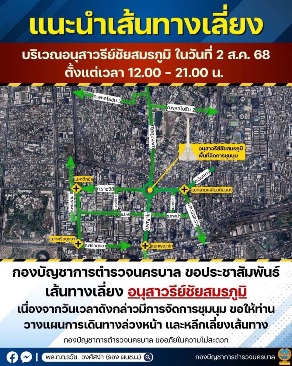 (31 ก.ค.68) บชน. แจ้งประชาสัมพันธ์เส้นทางเลี่ยงบริเวณอนุสาวรีย์ชัยสมรภูมิ ในวันที่ 2 สิงหาคม 2568 ตั้งแต่เวลา 12.00 - 21.00 น. เนื่องจากมีการชุมนุมบริเวณอนุสาวรีย์ชัยสมรภูมิ อาจส่งผลกระทบต่อการจราจรโดยรอบ