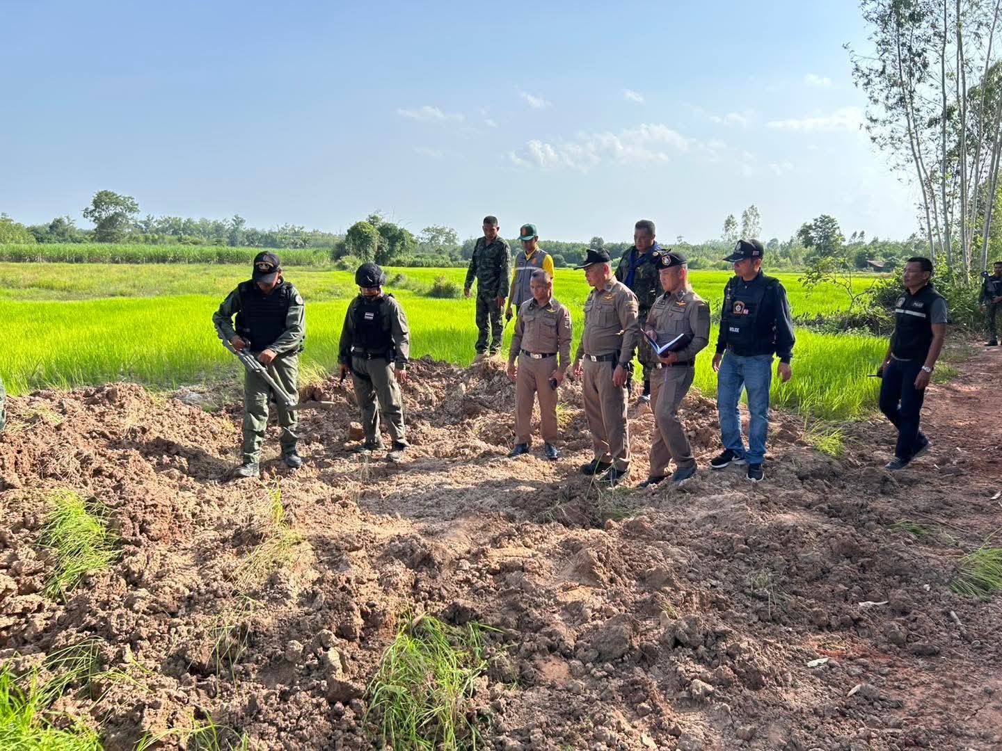 วันที่ 1 ส.ค.68 เวลา 16.50 น. ได้มีเจ้าหน้าที่ ประกอบด้วย เจ้าหน้าที่ตำรวจสังกัด สภ.น้ำขุ่น จ.อุบลราชธานี พ.ต.อ.ภูเพชร ลีเลิศ ผกก.สภ.น้ำขุ่น และเจ้าหน้าที่ตำรวจ ในสังกัดฯ เจ้าหน้าที่ฝ่ายปกครองประกอบด้วย จ่าอากาศเอกวิทมนต์ ไชยมงคล นายอำเภอน้ำขุ่น และ เจ้าหน้าที่ฝ่ายปกครอง อำเภอน้ำขุ่น เจ้าหน้าที่ฝ่ายทหาร และเจ้าหน้าที่เก็บกู้และทำลายวัตถุระเบิด และ ผู้ครอบครองที่ดินที่วัตถุระเบิดตกอยู่
