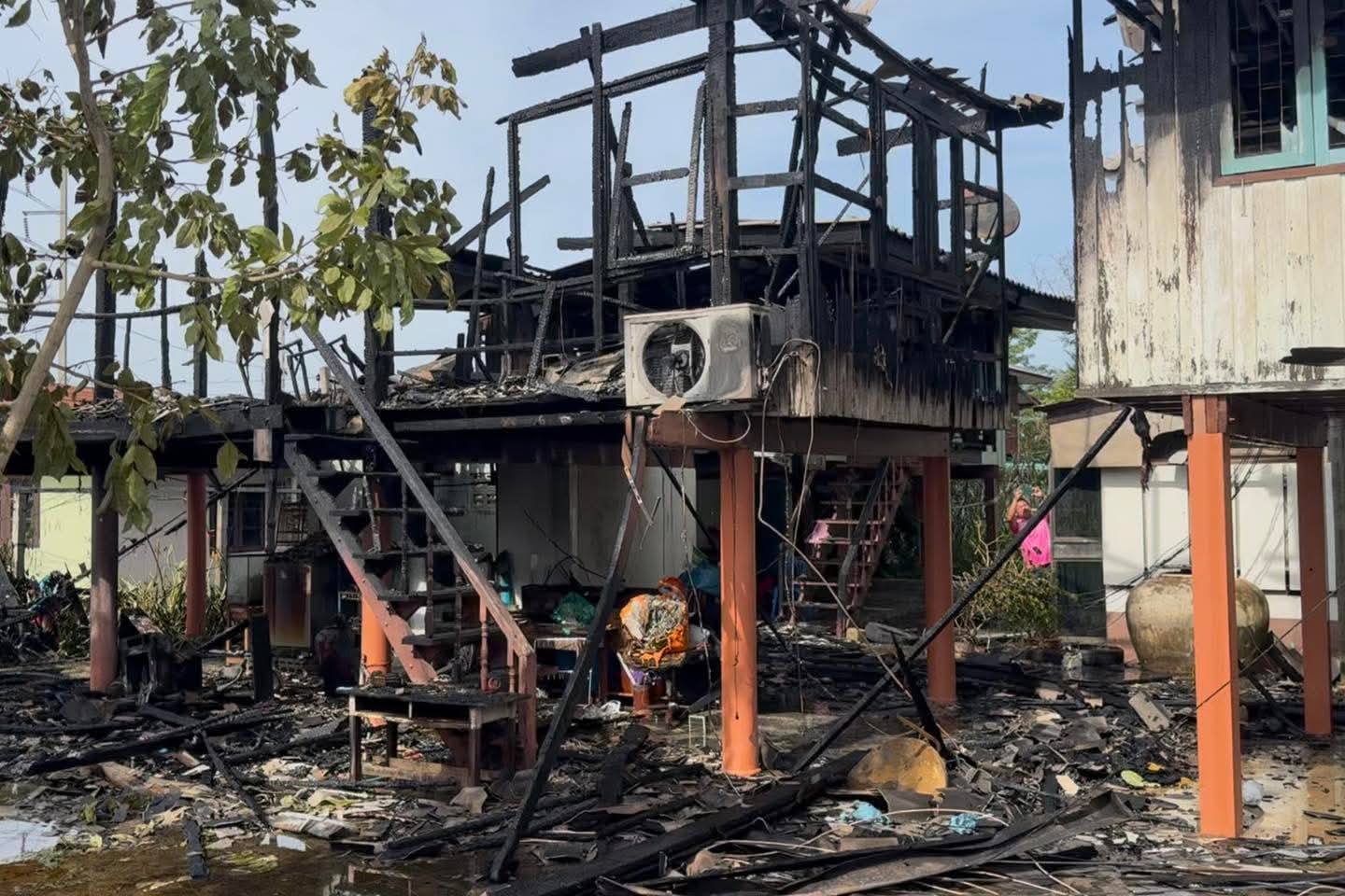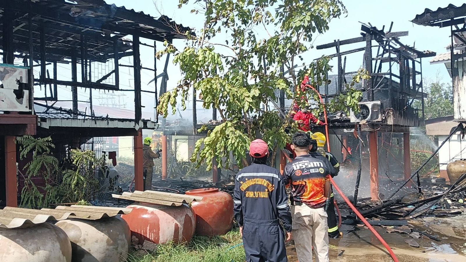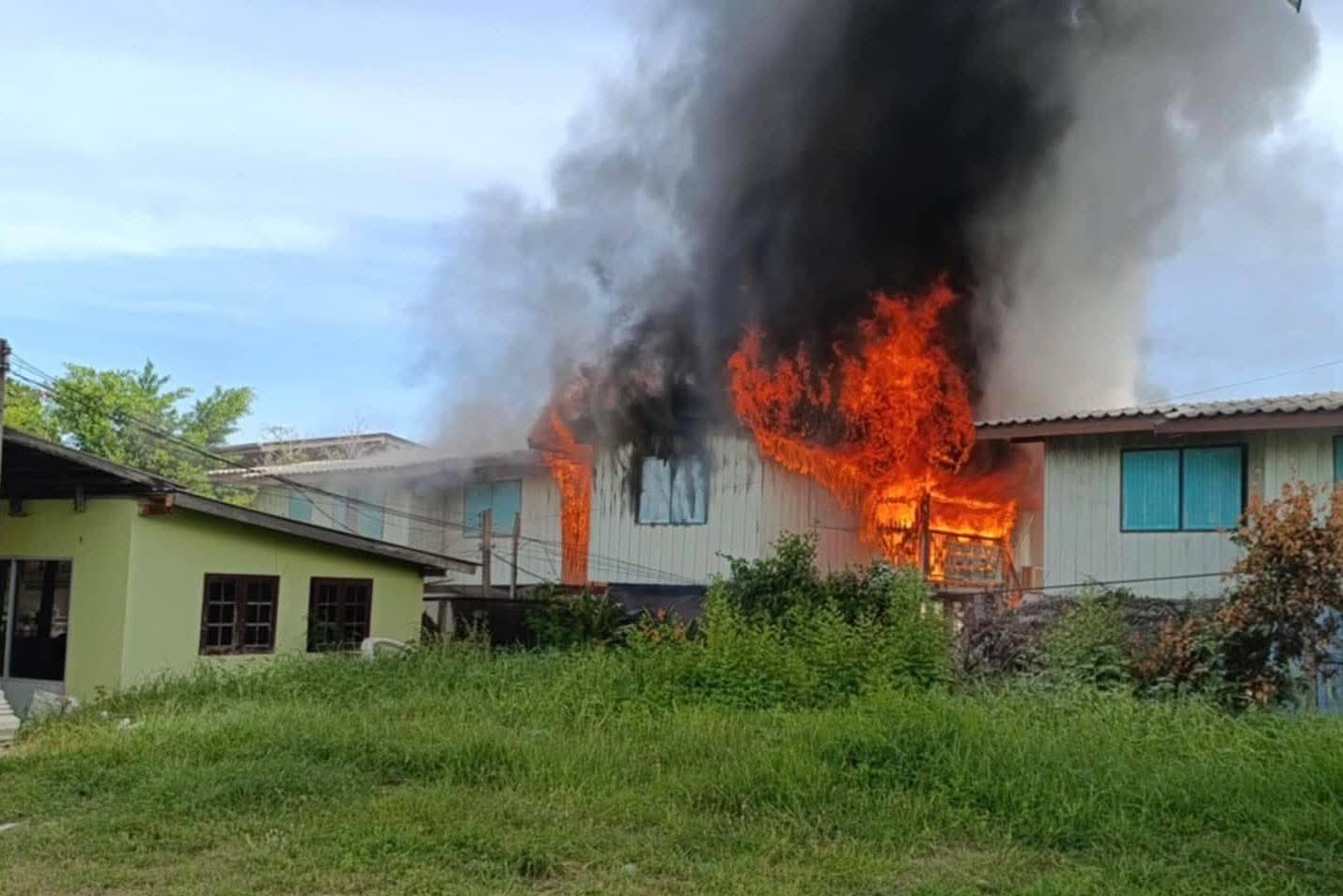 ไฟไหม้บ้านพักครู ข้าง อบต.บ้านปรก เจ้าหน้าที่ระดมกำลังฉีดน้ำควบคุมเพลิง เสียหายหลายหลัง จ.สมุทรสงคราม