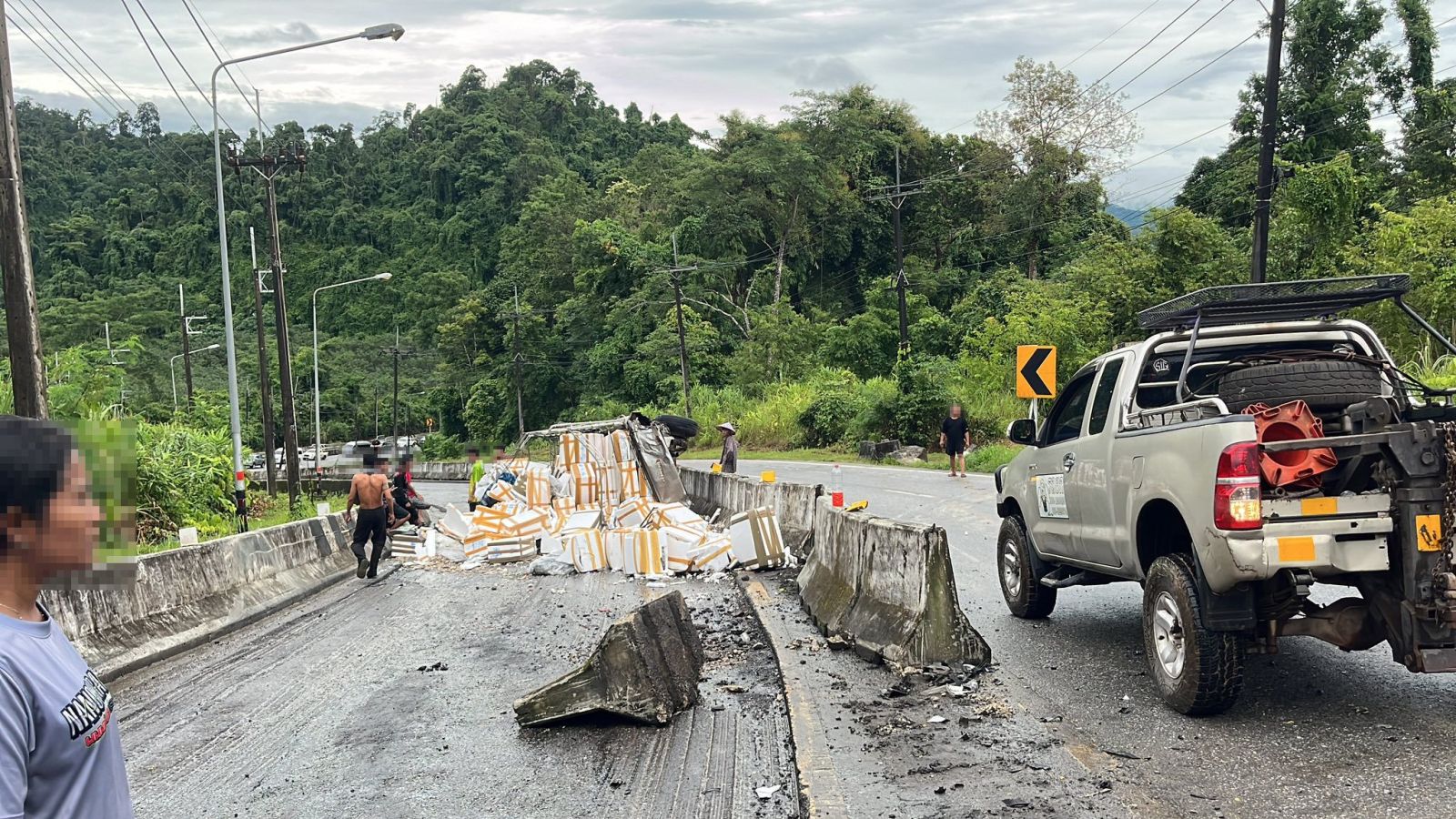 รถบรรทุก วิ่งลงโค้งเนิน 100 ศพ ถนนสายทองผาภูมิ - สังขละบุรี ชนกับรถคันหน้าเสียหายหลายคัน ส่วนคนขับเสียชีวิต จ.กาญจนบุรี